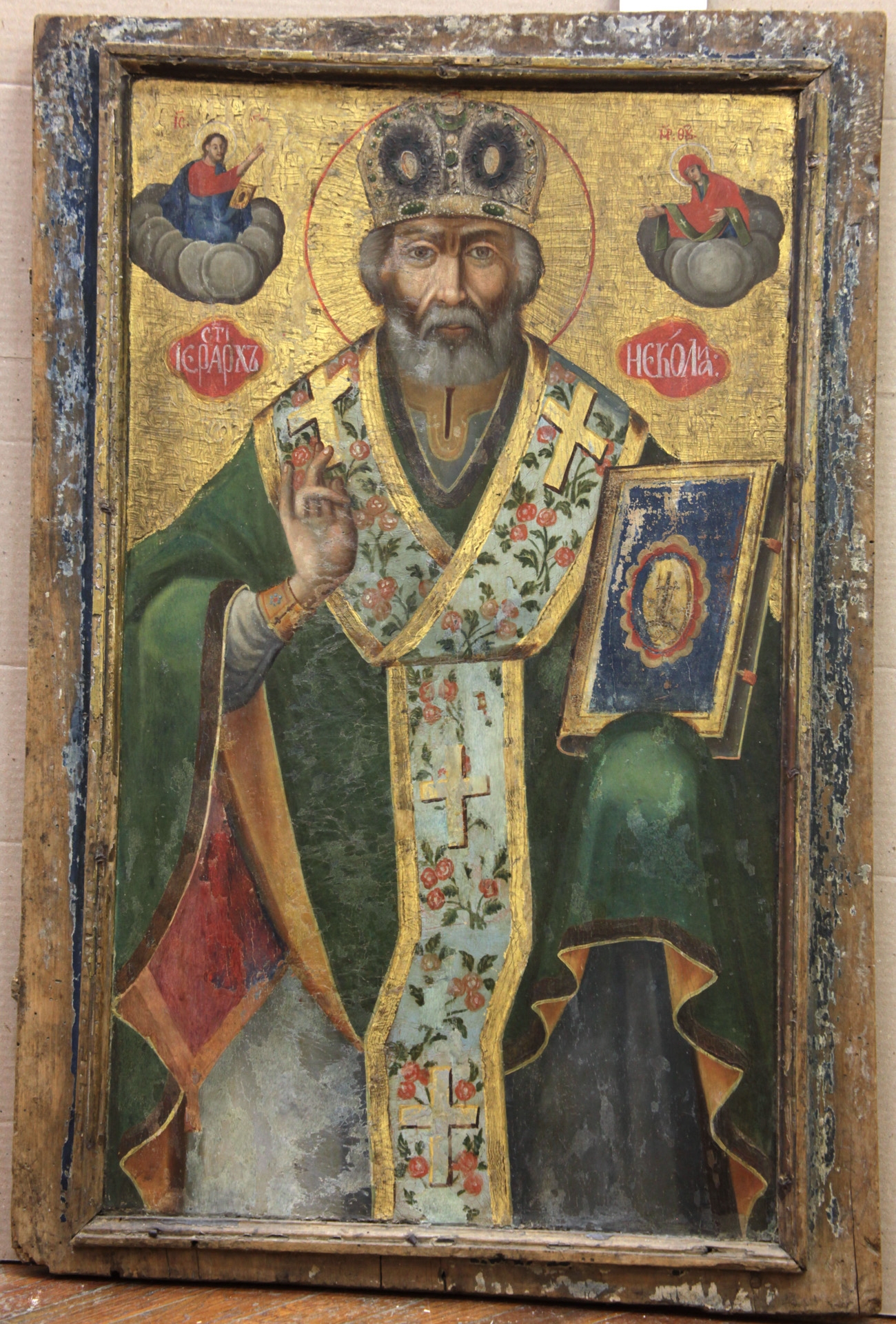 pînă la genunchi. Poartă chiton alb şi felon verde-închis, omofor deschis cu ornament floral (roşii). Într-o mînă ţine Evanghelia cu copertă albastră, cu alta binecuvîntează. În colţurile de sus - imaginile miniaturale ale lui Hristos şi Maicii Domnului pe nori. Hristos binecuvîntează pe Sfînt , Iar Maica Domnuli îi oferă omoforul. Fondal auriu în partea de sus.