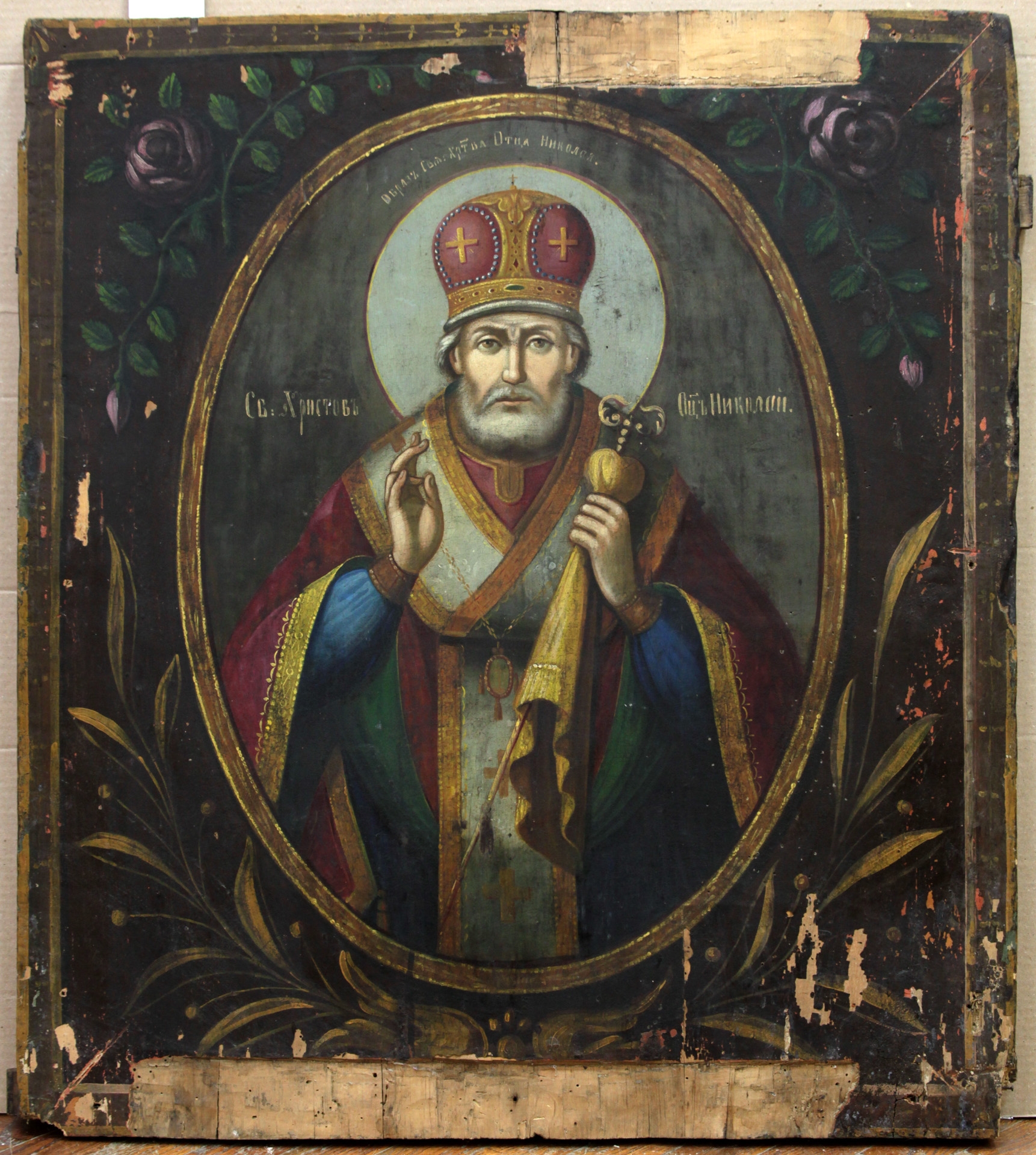 pînă la brîu, în veşmînt arhieresc (sacos bordo şi epitrahil alb-gri), cu mitră pe cap. Cu mîna drp binecuvîntează, în stg ţine un toiag arhieresc. Imaginea în cadru oval pictat. În afara ovalului - decor vegetal verde şi flori violete. Fondal închis.Nimbul e înconjurat de raze. Gama: argintiu, verde, auriu.