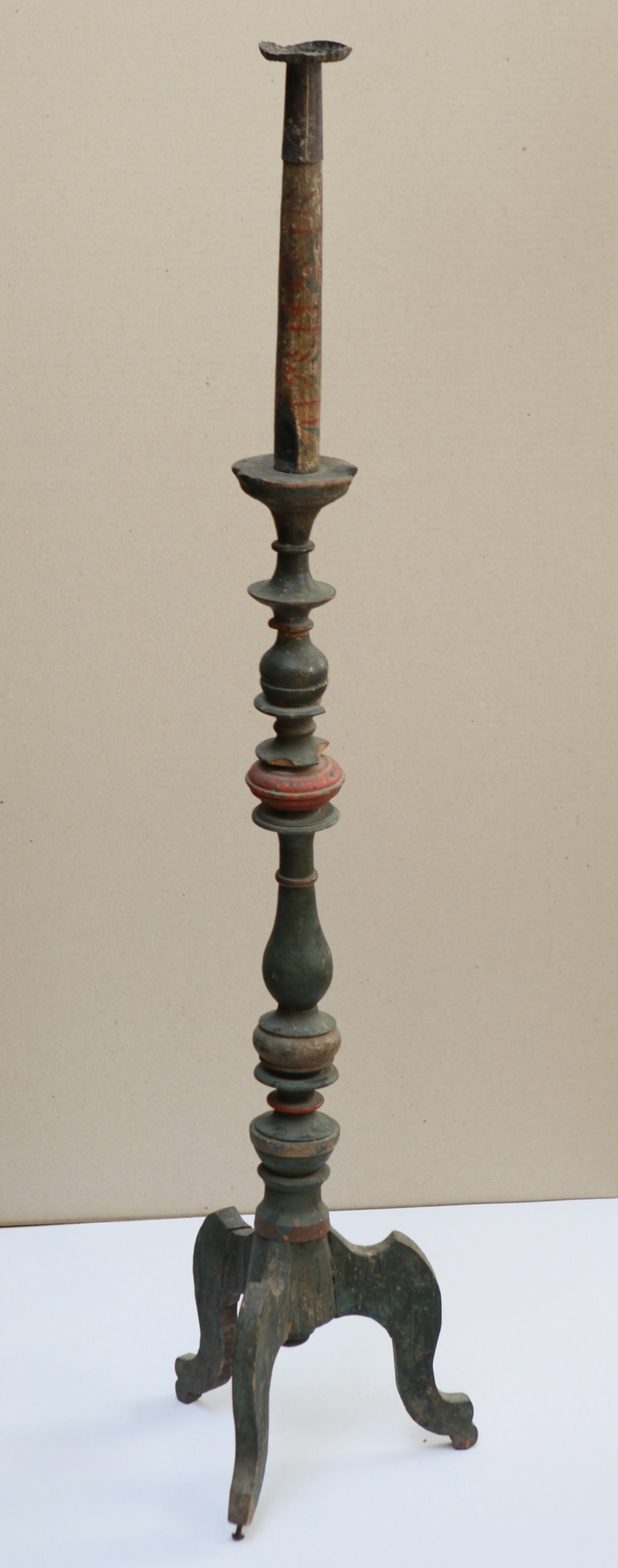 Sfeşnic din lemn. Se sprijină pe 3 picioruşe, cu fus lung, gît fără decor, în partea de jos - module discoidale, tubulare, circulare, zugrăvite. Suportul de lumînări e pierdut, fiind înlocuit cu o piesă metalică.