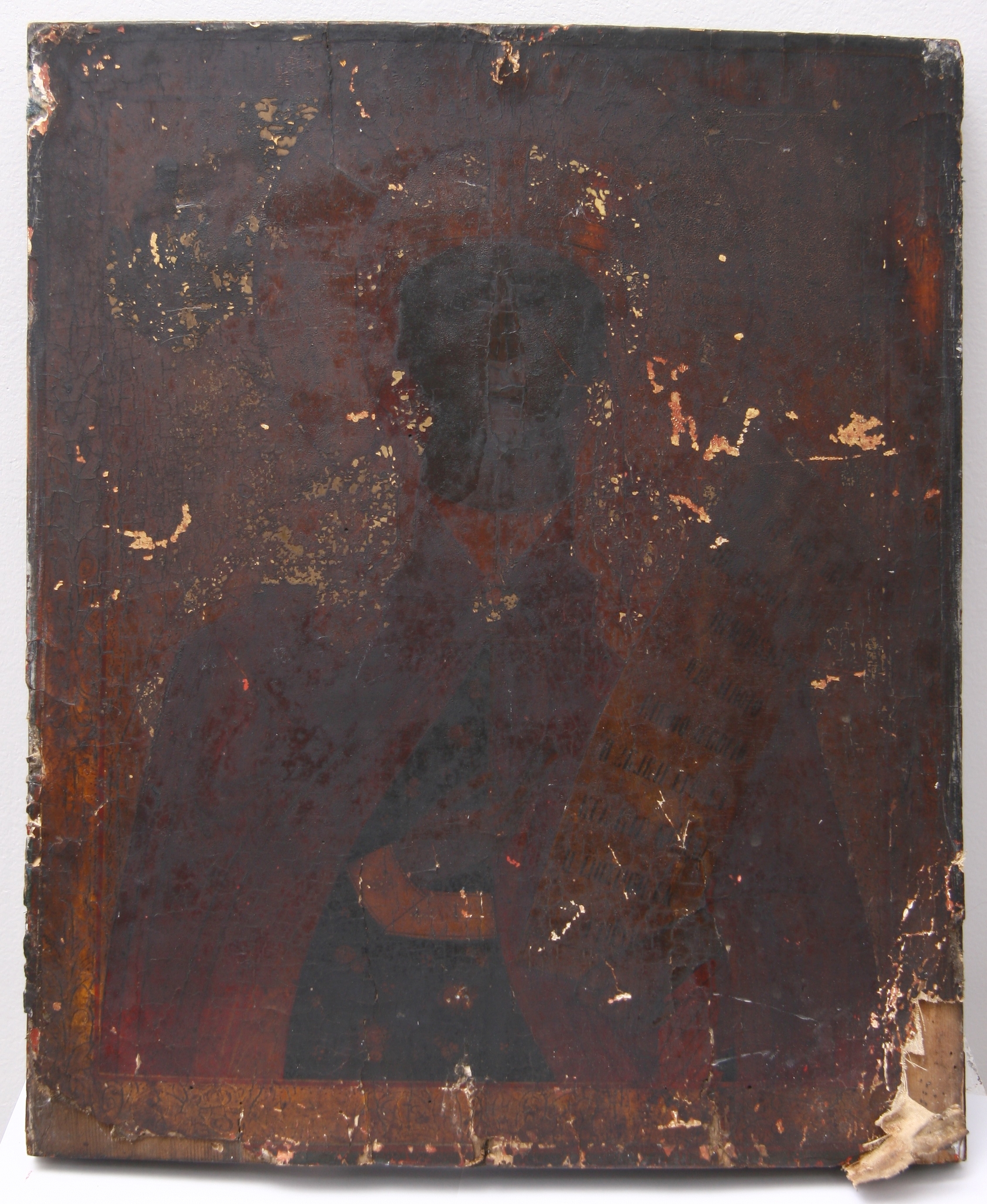 Chipul Sf. Parascheva (bust). În mîna dreaptă ţine un sul cu inscripţii slavone. Cea stîngă este uşor îndreptată spre sul, indicînd cu deget textul. Poartă mantie de culoare bordo.