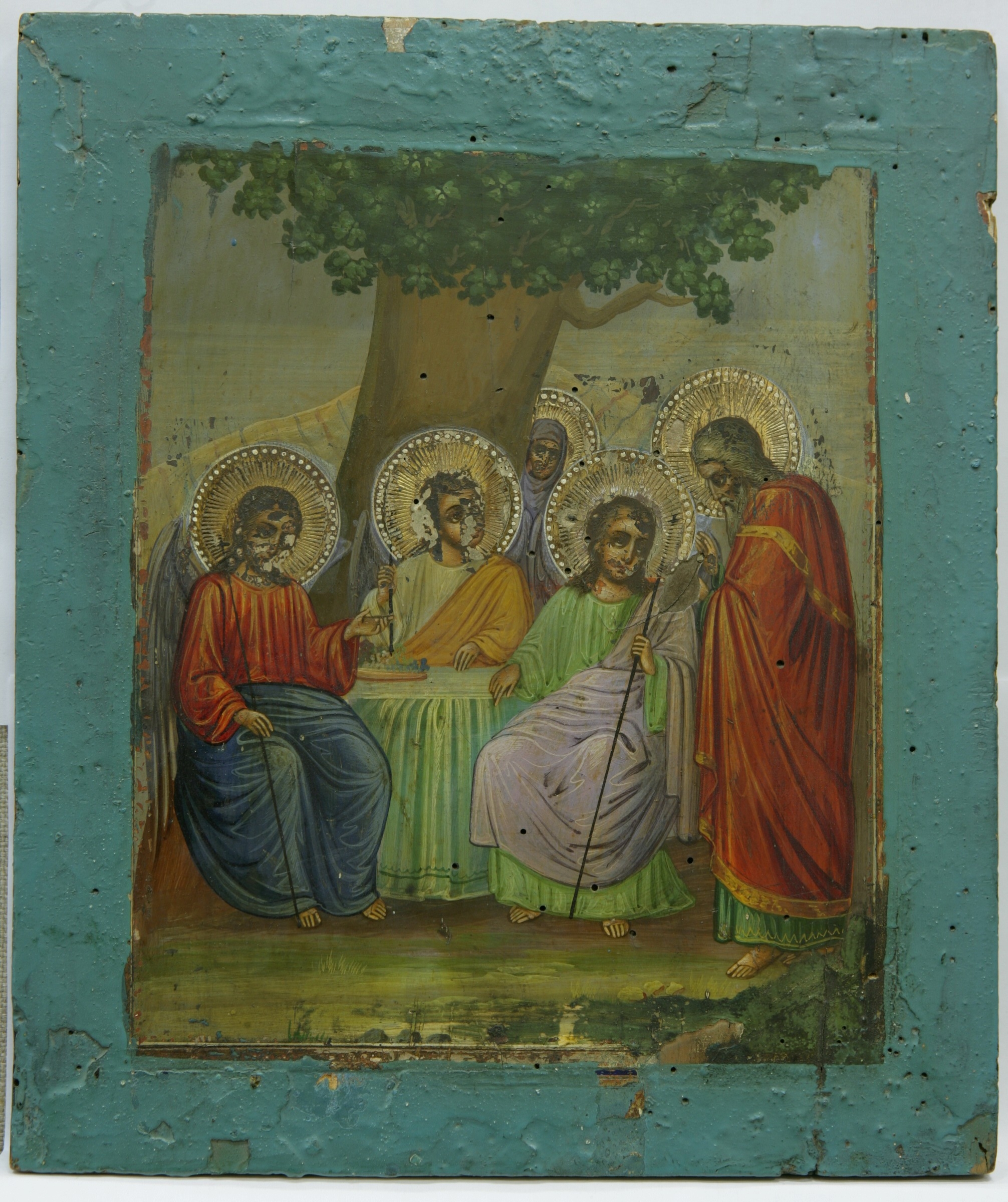 Centru: 3 îngeri aşezaţi la o masă, fiecare ţine în mînă o tijă. Drp, în statură: Avraam în mantie roşie, capul îi este uşor aplecat. Fondal: (centru) Stejarul Mavrei, după care se iveşte Sara, în depărtare - munţi. Gama: roşu, albastru, verde, ocru, alb, violet. Perimetru vierzui.