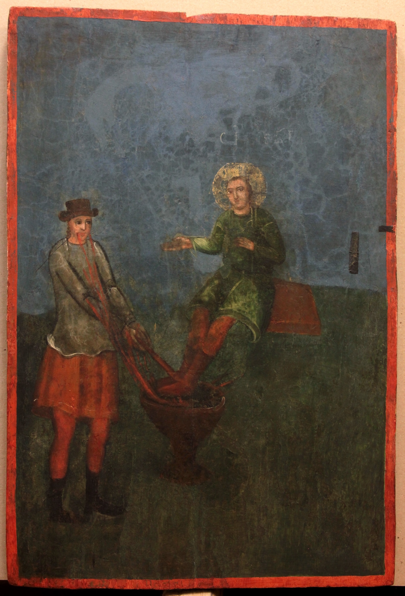 Icoană realizată în stil naiv. Sf. Gheorghe (centru-drp) în poziţie aşezată, poartă tunică verde şi încălţări roşii. Ţine picioarele de-asupra unui vas. (alături stg) Un tînăr ce-i curge sînge din obraji în acelaşi vas. Fondal (jos) verde şi (sus) albastru şi un balaur slab-vizibil.
