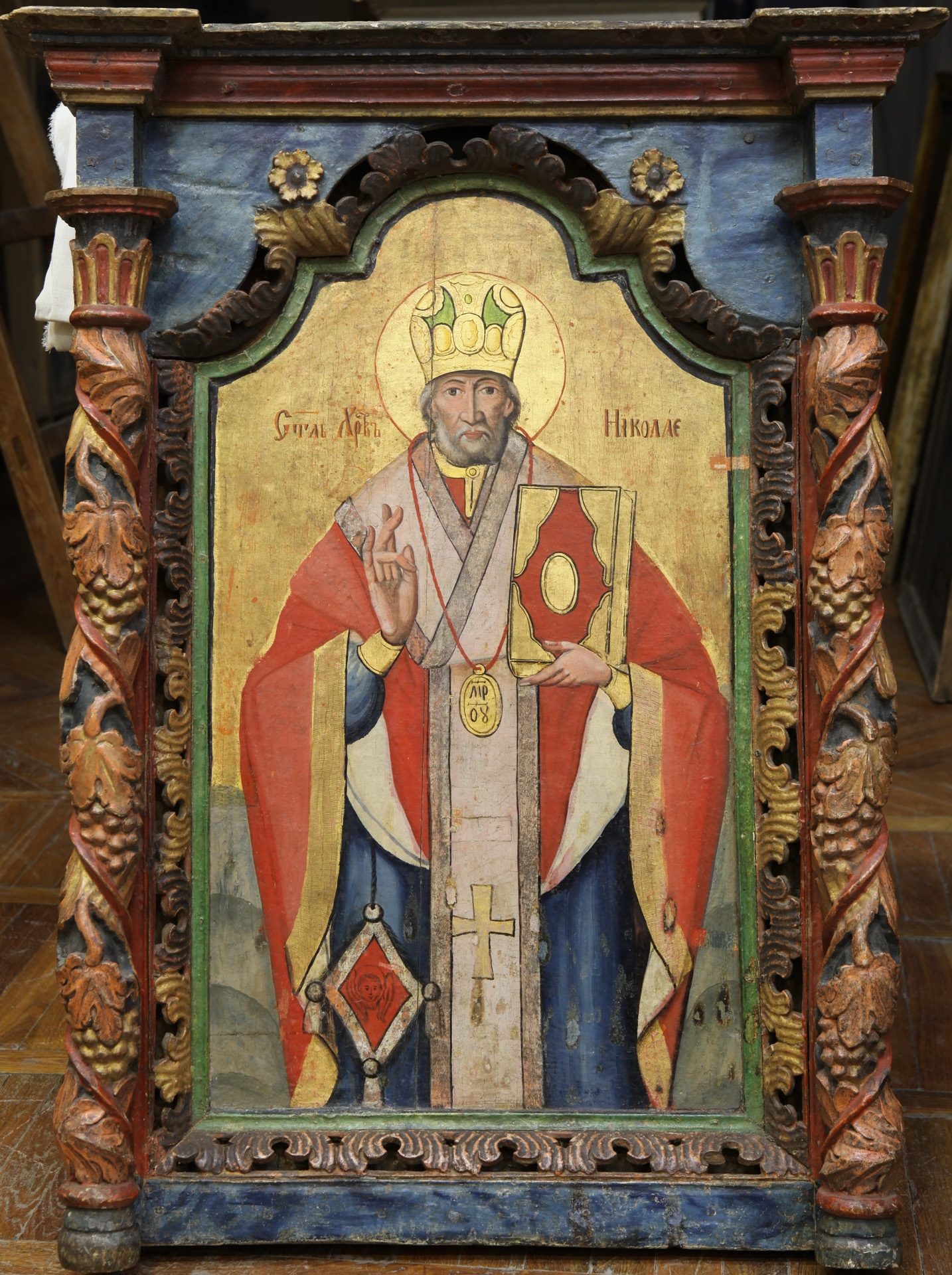 Pe fondal auriu - Sf Nicolae, frontal, pînă la genunchi, binecuvîntează cu drp, cu Evanghelia închisă în mîna stg. Poartă veşminte arhiereşti, sacos albastru, mantie roşie cu margini aurite, omoforul decorat cu cruci, epigonat, la piept - egalpionul, mitră de aur pe cap. Icoana în ramă cu decor sculptat vegetal, flancat de 2 coloane ornamentate cu viţă-de-vie.