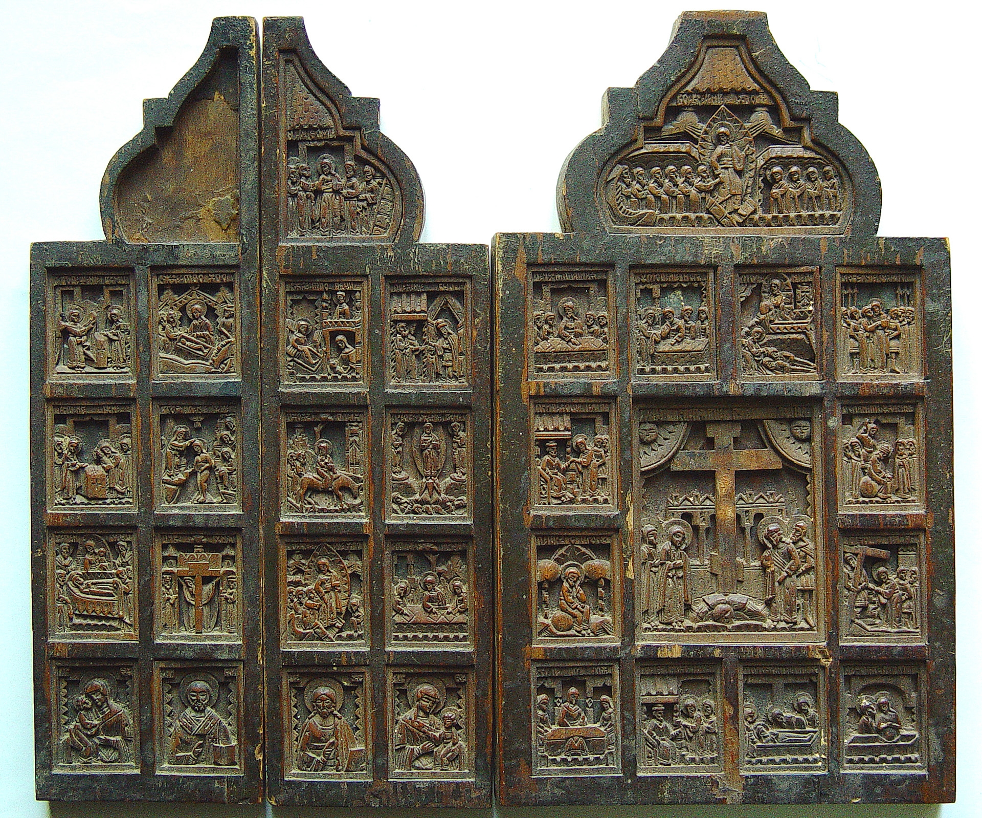 Piesă din 3 părţi. Formă: dreptunghi, cu vîrfuri decorative în formă de cupolă. Partea drp: în centru - cruce şi 4 sfinţi, soarele şi luna, pe perimetru - 12 scene din viaţa lui Hristos; sus - scena învierii. Partea stg: 12 scene ale sărbătorilor, Maica Domnului cu Pruncul, Iisus şi Sf. Nicolae; sus: Iisus şi apostoli.