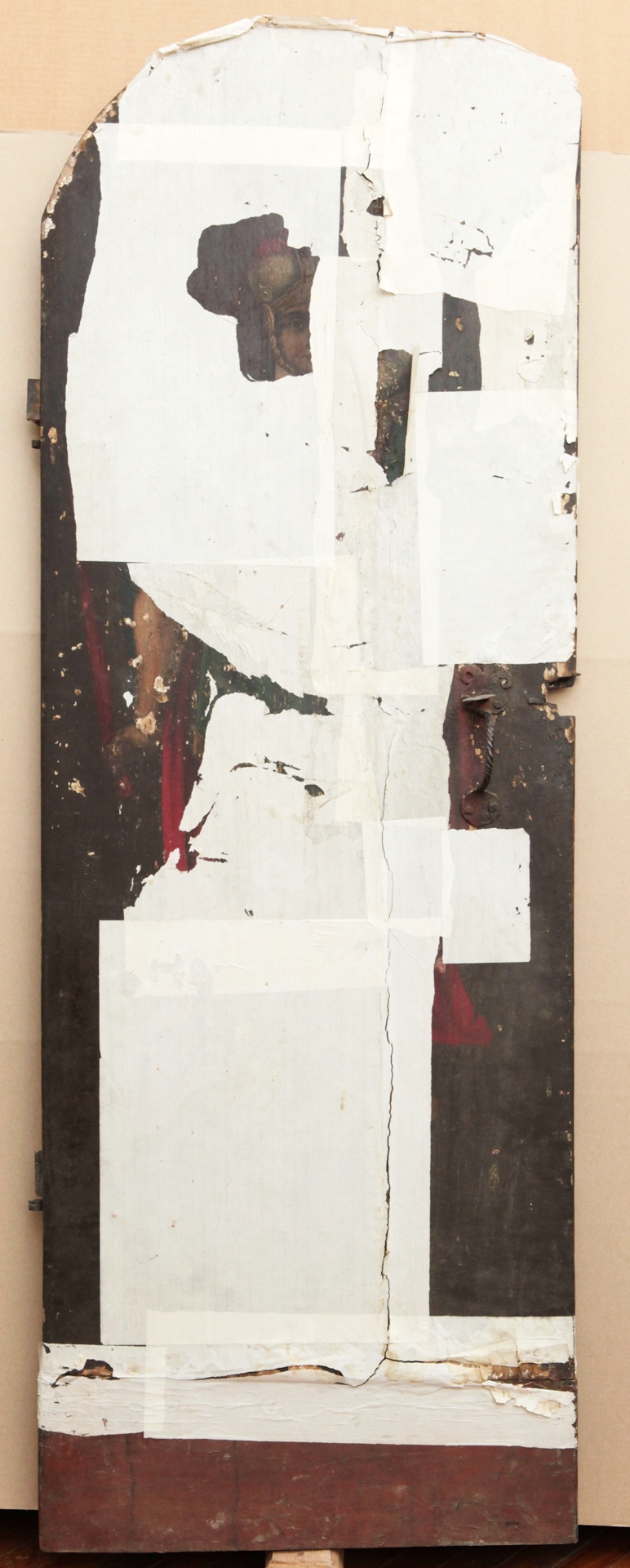 Uşă diaconească din partea stg a iconostasului cu imaginea Arh. Mihail în plină statură, frontal, în haine de ostaş roman. Pe uşă sunt balamale şi un mîner din metal forjat.