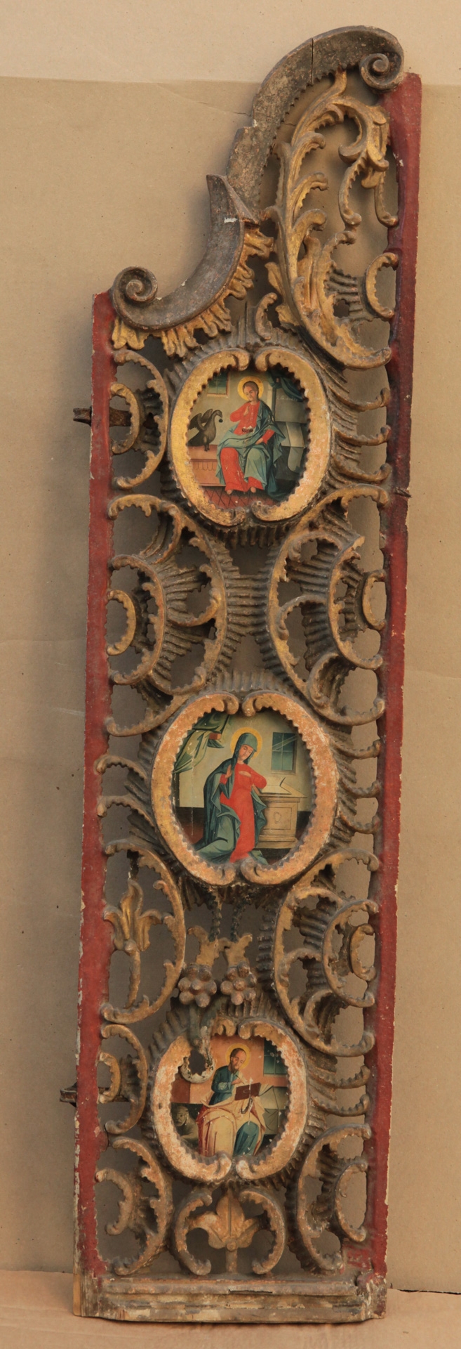 dreptunghiulară, arcuită sus. Pe verticală sînt sculptate 3 medalioane, încadrate în decor vegetal, sculptat în lemn. Medalionul de sus îl are reprezentat pe Evanghelistul Ioan; centru - Maica Domnului îngenunchiată; jos - Evanghelistul Marcu. Gama: roşu, albastru, ocru.