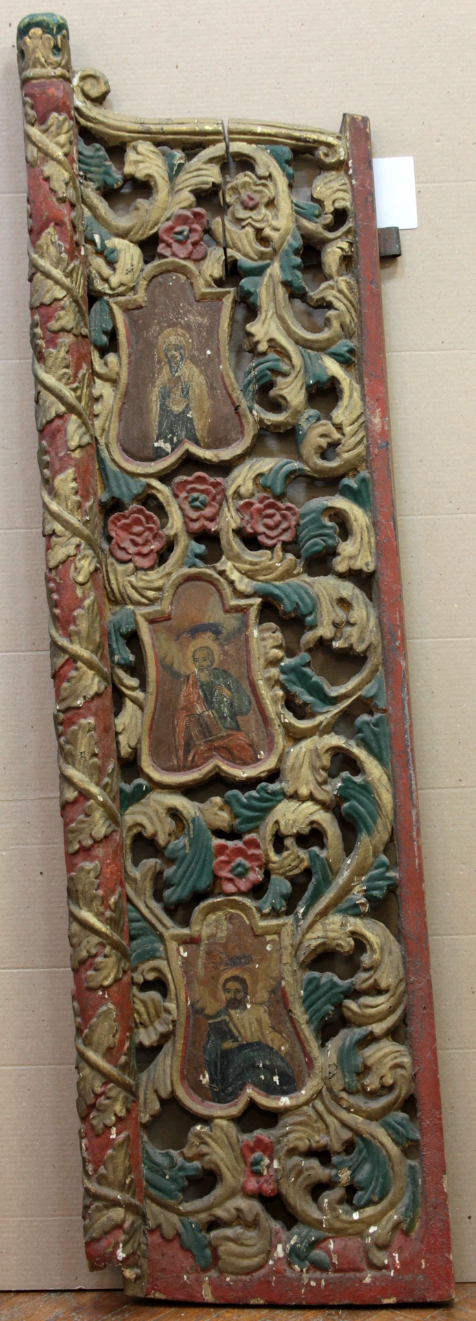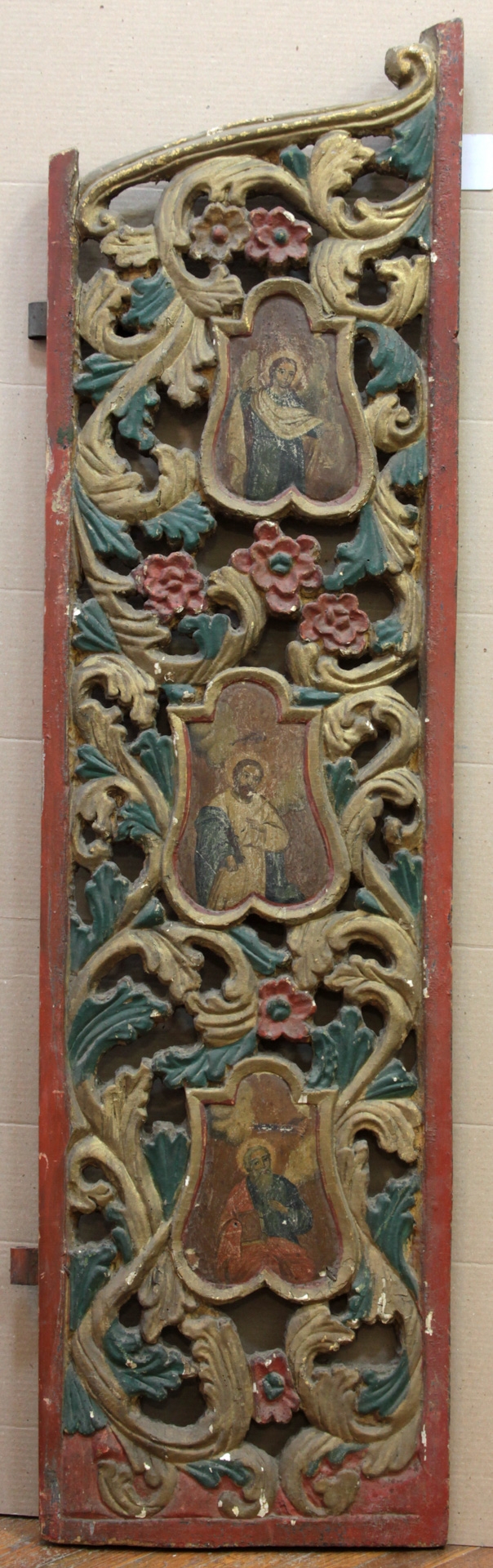 Fiecare canat al Uşilor împărăteşti conţine 3 medalioane (pe verticală) cu cei 4 evanghelişti şi Scena Bunavestirii. Medalioanele-s înconjurate de ornamente vegetale sculptate în lemn, zugrăvite. Gama: ocru, albastru-verzui, roşu, brun.