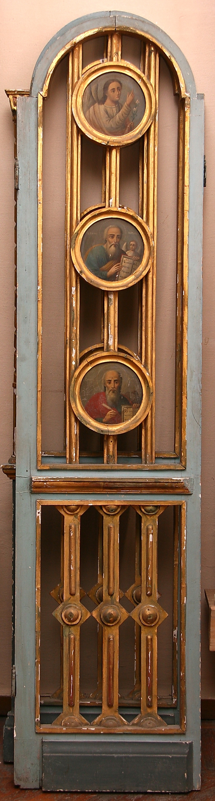 Are formă dreptunghiulară cu partea de sus rotunjită. Este împărţit în două registre, cu trei zăbrele verticale, cu funcţie decorativă. În fereastra de sus: trei medalioane prinse de zăbrele. În medalionul de sus - Arhanghelul Gabriel cu ramură de crin alb în mîna stîngă, iar cea dreapta ridicată în sus. Jos în celelalte medalioane: Evanghelistul Matei cu simbolul distinct - îngerul şi Evanghelsitul Ioan - cu vulturul.