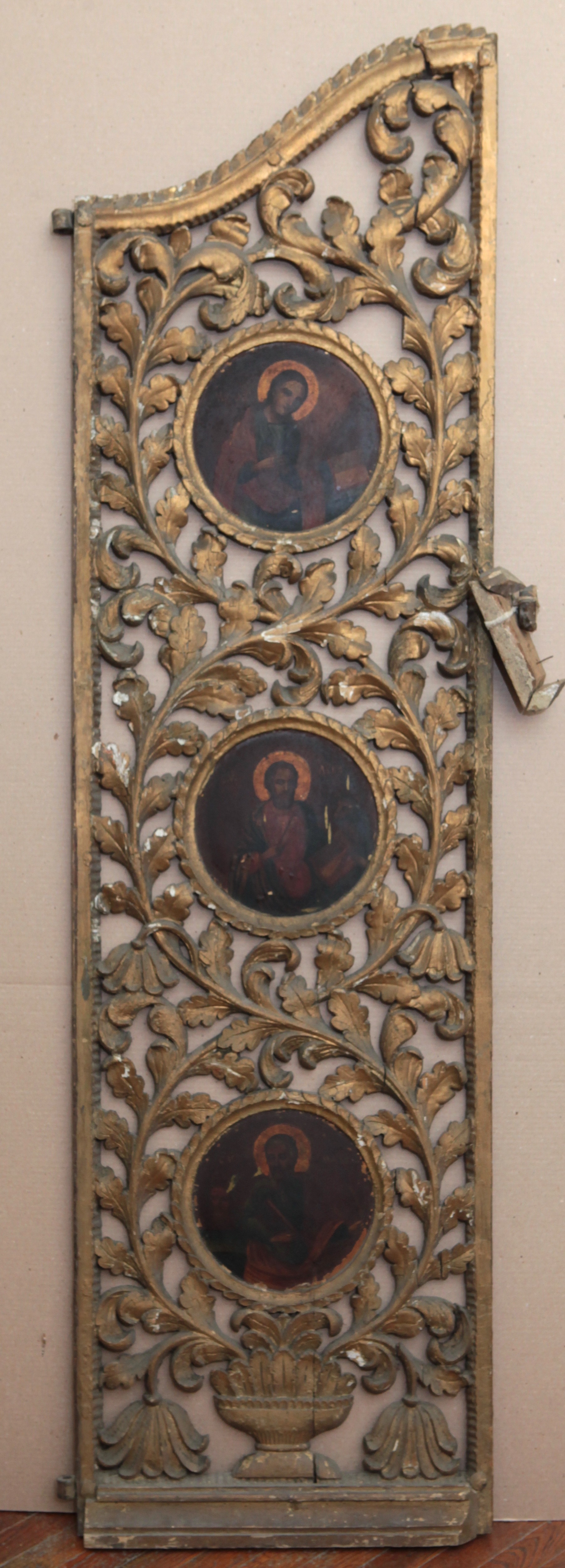 Uși împărătești sculptate în lemn, arcuite sus. Coloana din centru conţine decor vegetal fiind acoperită cu o mitră. Fiecare canat are cîte 3 medalioane: chipurile Maicii Domnului, Arhanghelul Mihail şi cei 4 evanghelişti însoţiţi de un simbol propriu. Decor traforat vegetal.