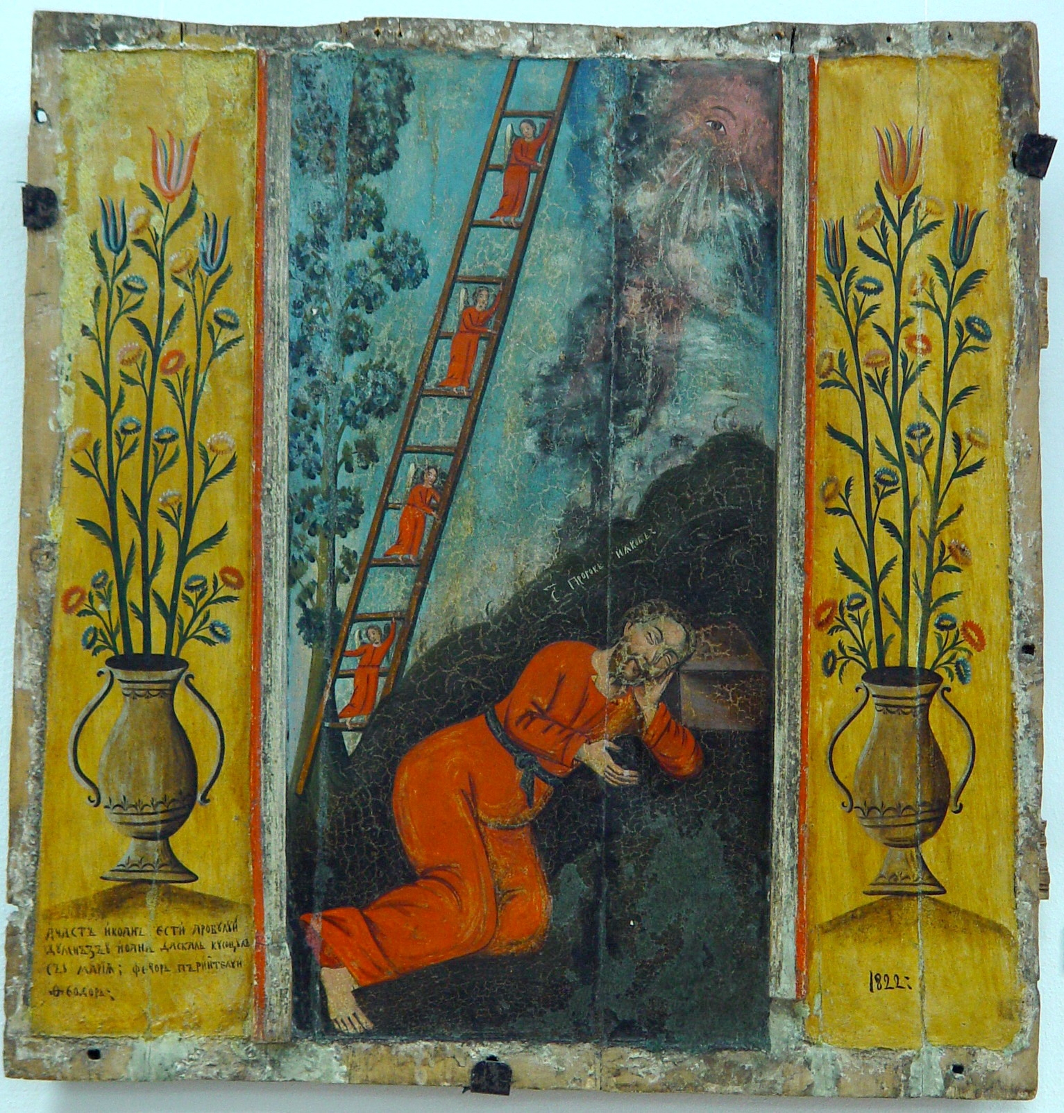 Centru: Iacov doarme la pămînt. Alături: scară ce urcă pînă la cer, pe treptele căreia - îngeri în veşminte roşii. La linia orizontului - copaci. Sus drp: Ochiul Atotvăzător. Cer crepuscular. Lateral icoanei: vaze cu ramuri înflorite. Gama: ocru, albastru, roşu, brun.