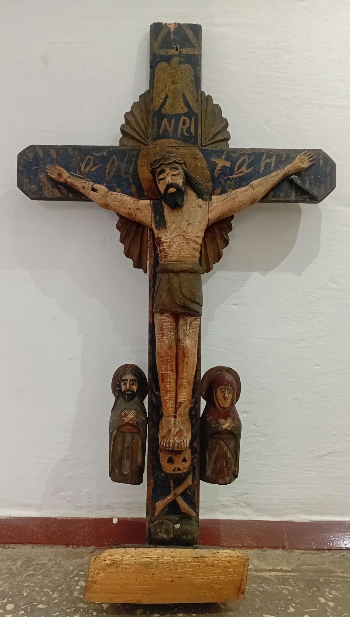 Crucifix. Piesa - din lemn și sculptată manual. Piesa reprezintă o Cruce cu corpul lui Iisus Hristos pe ea. Piesa - simbol creștin major, ce evidențiază moartea lui Iisus prin crucificare. Textul „INRI” - deasupra capului lui Iisus, acronim latin pentru „Iisus Nazarineanul, Regele Iudeilor”. La baza Crucii - sculptat simbolul unui craniu și oase încrucișate. De asemenea la baza Crucii, picioarele lui Iisus sunt flancate de 2 figuri adăugătoare - Sfânta Maria și Sfântul Ioan Evanghelistul. Cromatică: albastru, negru, roșu închis, cafeniu, roz pal.