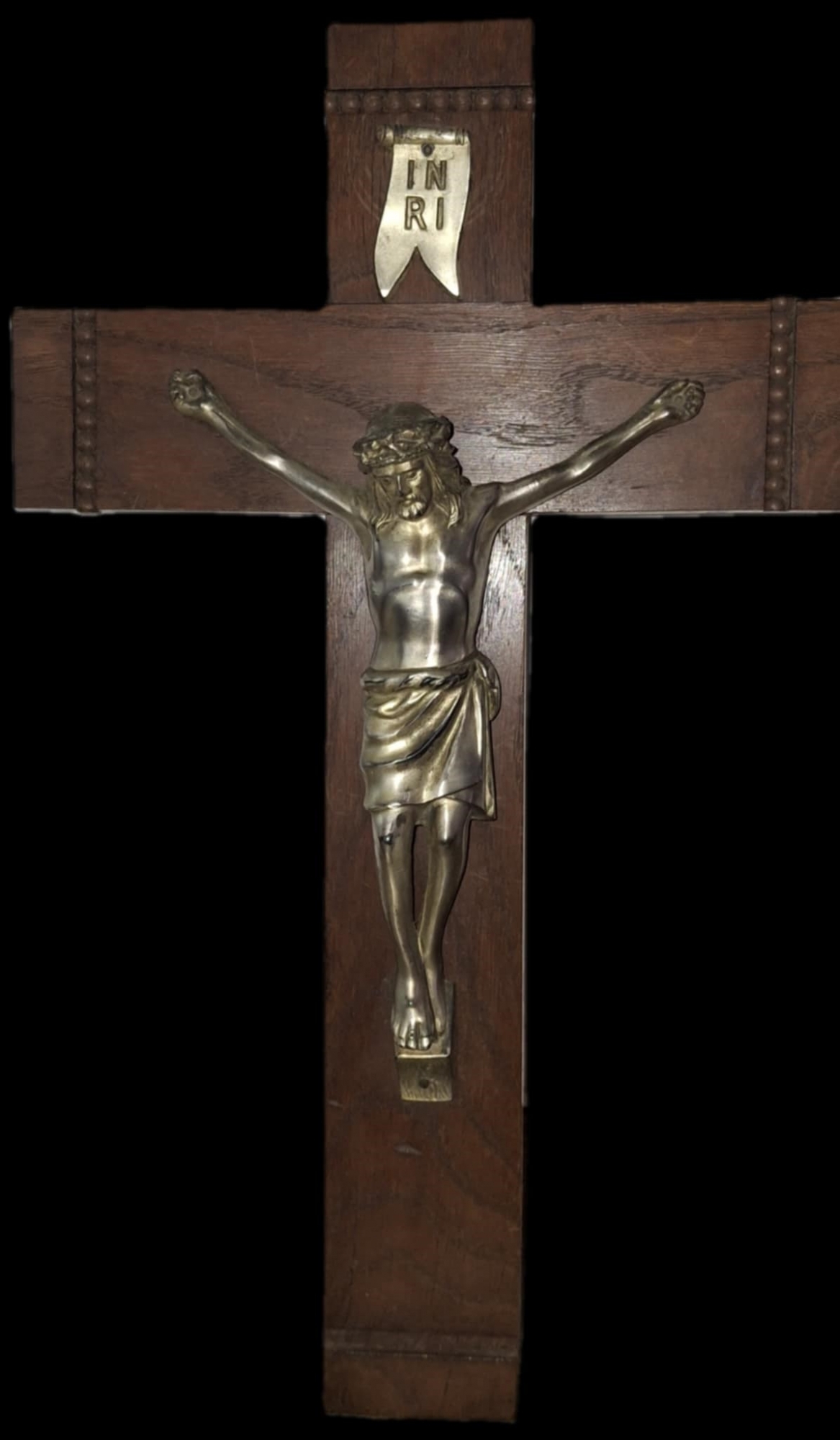 Crucifix de origine occidentală, catolică. Crucea este din lemn masiv, lăcuit, Isus Hristos și inscripția sunt turnate din metal. Pe capetele laturilor este o linie cu forme de semi cerc în relief. În partea superioară este o buclă din metal de care se prindea de perete.