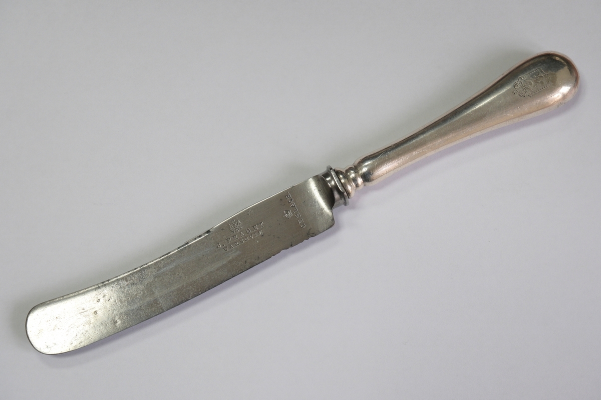 Cuțit alcătuit din două segmente: lamă tip spatulă și mâner. Lama din alpacă, cu vârful rotunjit, este mărginită spre mâner cu două brâuri inelare. Pe fața stângă a lamei, spre bază, este aplicată stema Imperiului Rus, marca atelierului J. FRAGET VARSOVIE și inscripția GERLACH înscrisă sub coroana imperială. Mânerul elipsoidal în secțiune, cu terminația semicirculară, este decorat, cu simboluri heraldice. Pe fața stângă - stema Guberniei Basarabia, pe dreapta este poansonată stema Imperiului Rus și inscripția FRAGET PLAQUE, încadrată în două dreptunghiuri despărțite de inscripția MB, încadrată într-un romb.