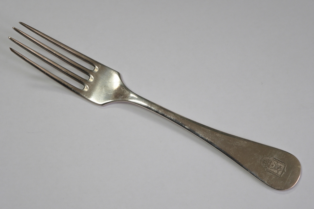 Furculiță medie prevăzută cu o placă ușor arcuită, cu patru dinți mari, lați la bază și ascuțiți la capete, placă ce se subțiază către zona de începere a mânerului. Mânerul în formă de lacrimă cu suprafața netedă, lucioasă este decorat cu simboluri heraldice (stema Guberniei Basarabia); pe revers este poansonată stema Imperiului Rus și inscripția FRAGET PLAQUE, încadrată în două dreptunghiuri despărțite de inscripția MB, încadrată într-un romb și inscripția B. M a.