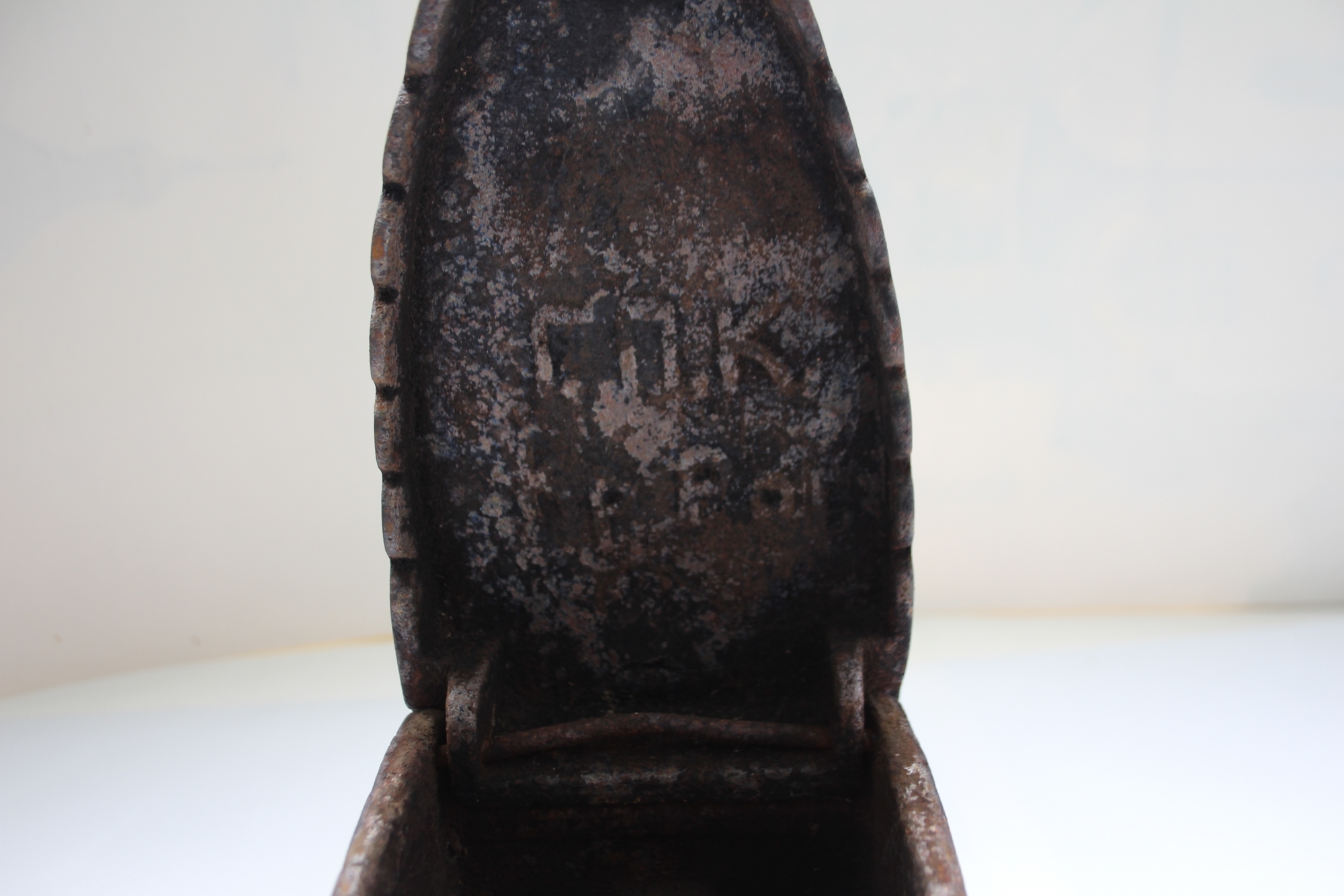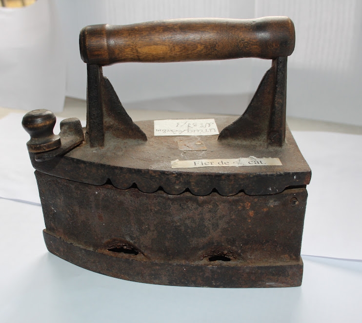 Fierul de călcat este confecționat din fontă, are formă triunghiulară iar la partea superioară prezintă o protuberanță care avea rolul practic de a închide capacul fierului, dar și rol oarecum artistic. Acest fier de călcat funcționa cu ajutorul cărbunilor aprinși introduși în corpul lui, care încălzeau talpa fierului și în acest fel se puteau netezi rufele. Fierul prezintă un mâner din lemn la partea superioară pentru a fi manevrat cu ușurință, deși este destul de greu, iar lateral prezintă niște orificii care aveau rolul de a scoate fumul produs ce cărbunii aprinși. Ceea ce diferențiază fiarele de călcat sunt acele figurine care aveau și rol funcțional, figurine ce reprezintă cocoși, lei, șerpi, delfini. Cromatica: culoare fontei, culoarea lemnului natural. Există o gravură pe interiorul capacului de fier :gravat, în metal, G.P.K gr Rog (Г.П.К гр Рог) Presupun că producătorul a fost : Ucraina or. Krivoi Rog Gospromkombinat 1950-60 ( Украина Кривой Рог Госпромкомбинат 1950-60 гг)