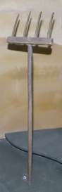 Unealtă agricolă formată dintr-o prăjină de care e prinsă o bară orizontală având 4 dinți ascuțiți; funcție utilitară
