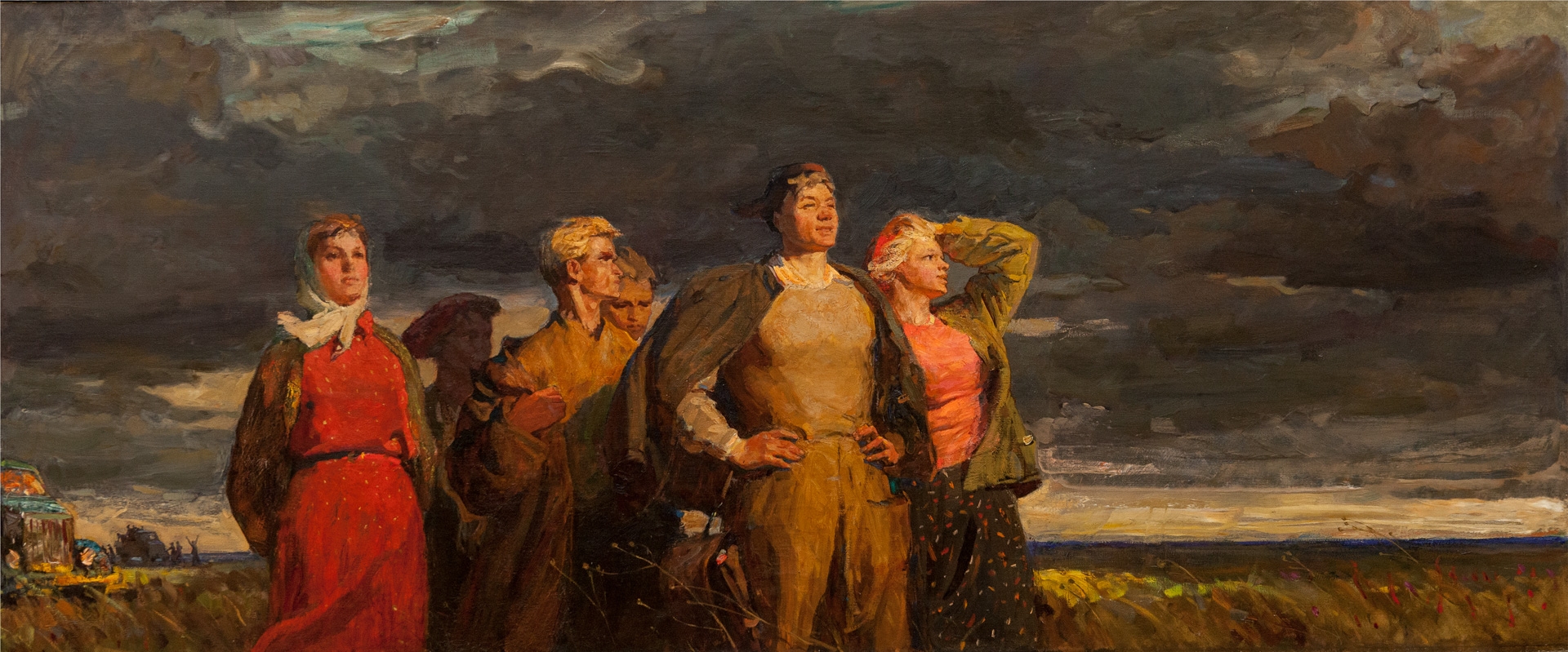 Scenă de gen în peisaj. În prim plan - un grup de femei și bărbați, în semiprofil spre dreapta, în plină statură, privind în depărtare. Poartă haine de lucru. În centrul compoziției - un bărbat ținînd mîinile la brîu. Fondal - cer întunecat.