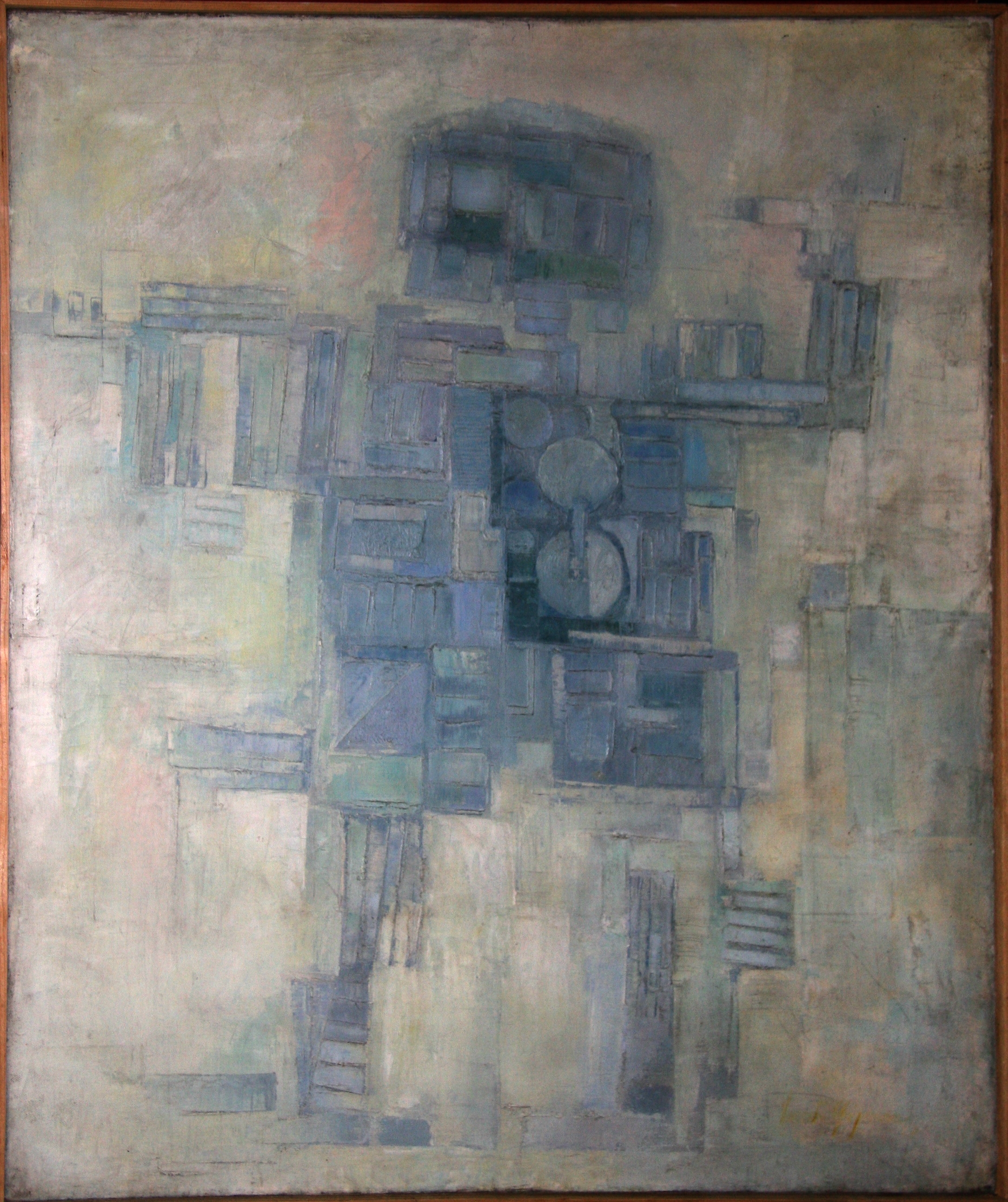 Pe fondal deschis e reprezentat un robot humanoid, pictat pastuos în nuanţe de albastru-deschis.