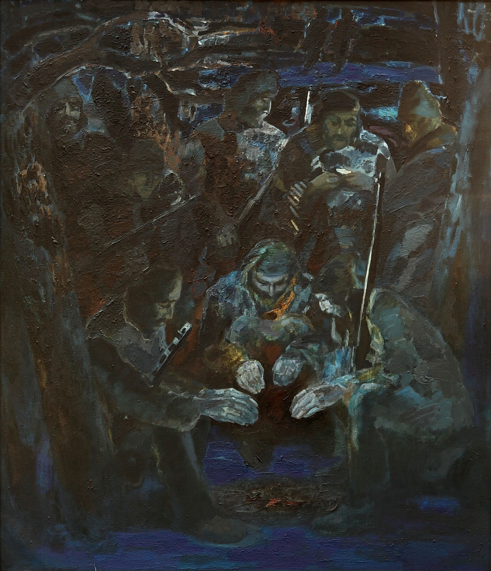 Grup de bărbaţi înarmaţi, văzuţi prin întunericul nopţii, se-ncălzesc la foc de tabără.
