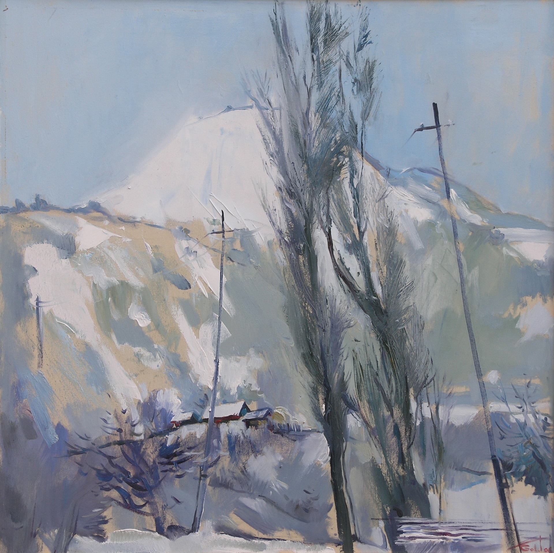 Peisaj de iarnă. În prim plan, dreapta-doi plopi înalţi flancaţi de doi stâlpi cu fire electrice.Plan secund, stânga, pe o colină se remarcă trei case ţărăneşti. Fondal- munţi, parţial înzepeziţi. Cer senin. Gama cromatică azuriu, alb. Jos, dreapta, colţ, semnat, datat.