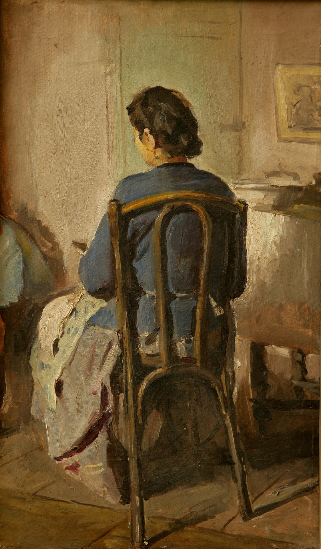 În odaie - femeie aşezată, privită din spate. Păr scurt castaniu. În fustă lungă şi vestă de culoare bleumarin. Drp: fragment de masă. Fondal: perete şi un tablou în drp.