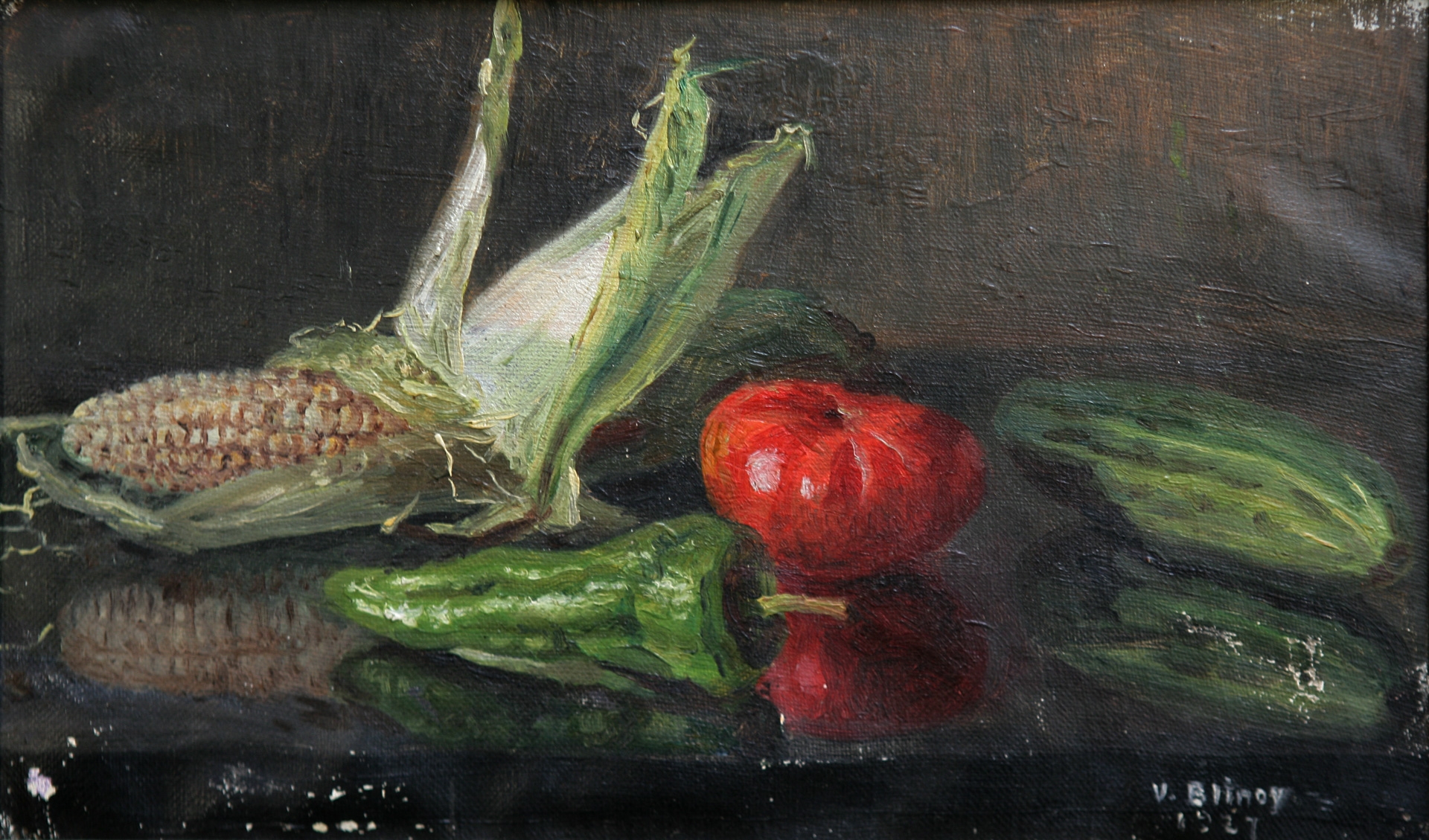Pe suprafaţă întunecată, reflectantă - roşii, castraveţi, porumb şi ardei verde. Fondal neutru întunecat. Datat.