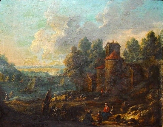 Este reprezentat un fragment de râu. Pe maluri – construcții arhitecturale, copaci, grupuri de personaje odihnindu-se. Cer cu nori. Jos stânga monograma MB și data 166.