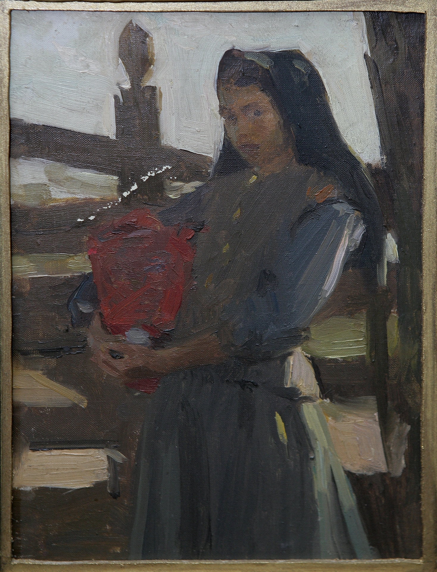Pe fondal de gard de scînduri - fată în straie ţărăneşti, văzută din 3/4 spre stg. Pe cap poartă o broboadă de culoare întunecată. În braţe ţine un coş roşu.