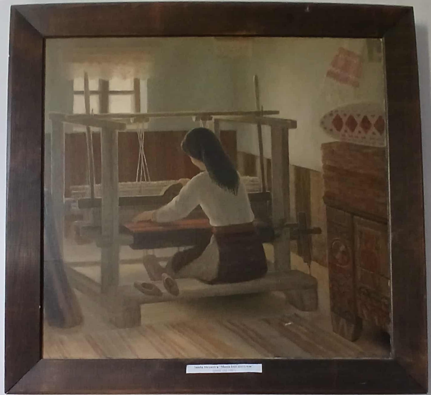 Tablou ce reprezintă o femeie tânără, îmbrăcată în costum popular, țesând la războiul de țesut într-un interior tradițional țărănesc. Lumina blândă a ferestrei și elementele gospodărești creează o scenă autentică din viața rurală.