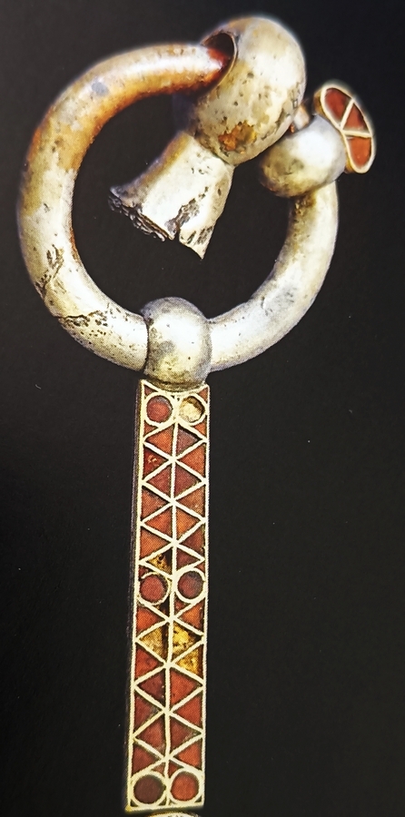 Zăbale reprezentând o veriga de argint, de la care este fixată, printr-un laț (clemă), o placă îngustă de aur, cu încrustări de email colorat. Veriga este confecționată din fier, acoperită cu un strat de argint. De veriga de argint sunt fixate trei cleme, una dintre care este de fier, acoperită cu argint. Cealaltă clemă, la fel este de argint, fiind unită, prin sudare cu fragmentul unei aplici de aur, de formă semi-ovală, cu trei secțiuni (una triunghiular, celelalte două semi-ovale) umplute (incrustate cu email). Pe aplică lungă de 60 mm, decorul est compus din secțiuni triunghiulare și circulare, incrustate cu email colorat, cu nuanțe de la vișiniu la portocaliu. Piesa nu a păstrat câtva incrustări cu email de formă triunghiulară și circulară.
