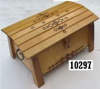 lădiței este câte o tortiță din metal. Toată suprafața exterioară a casetei e lăcuită. E decor geometrizant. Culori: galben,
