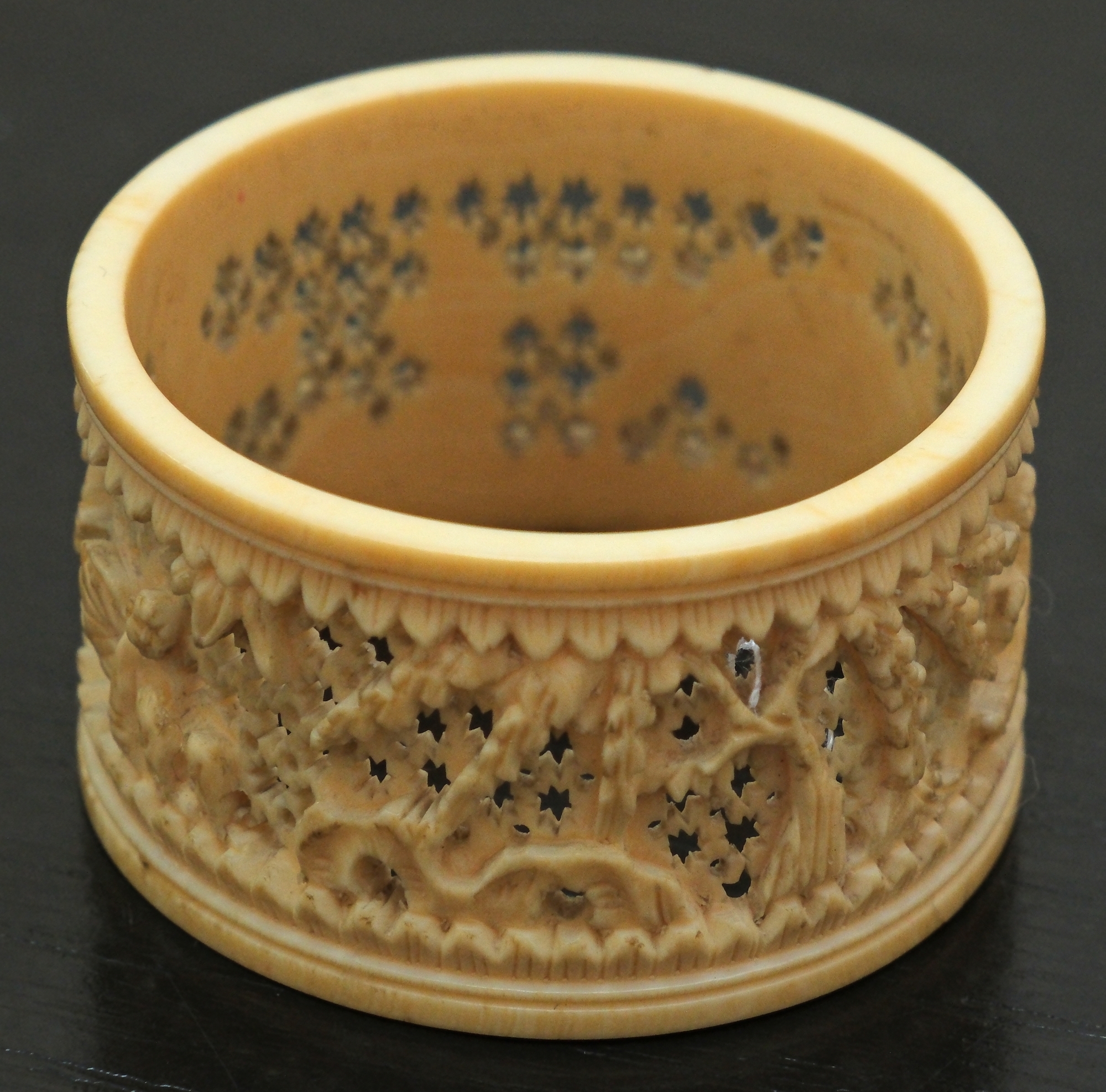 Inel de masă, cu aspect cilindric, lucrat în fildeș, incluzînd contururi precise și linii clare ale elementelor vegetale îmbinate cu elemente geometrice și figurative, conturate în cîmp continuu de două benzi unghiulare.