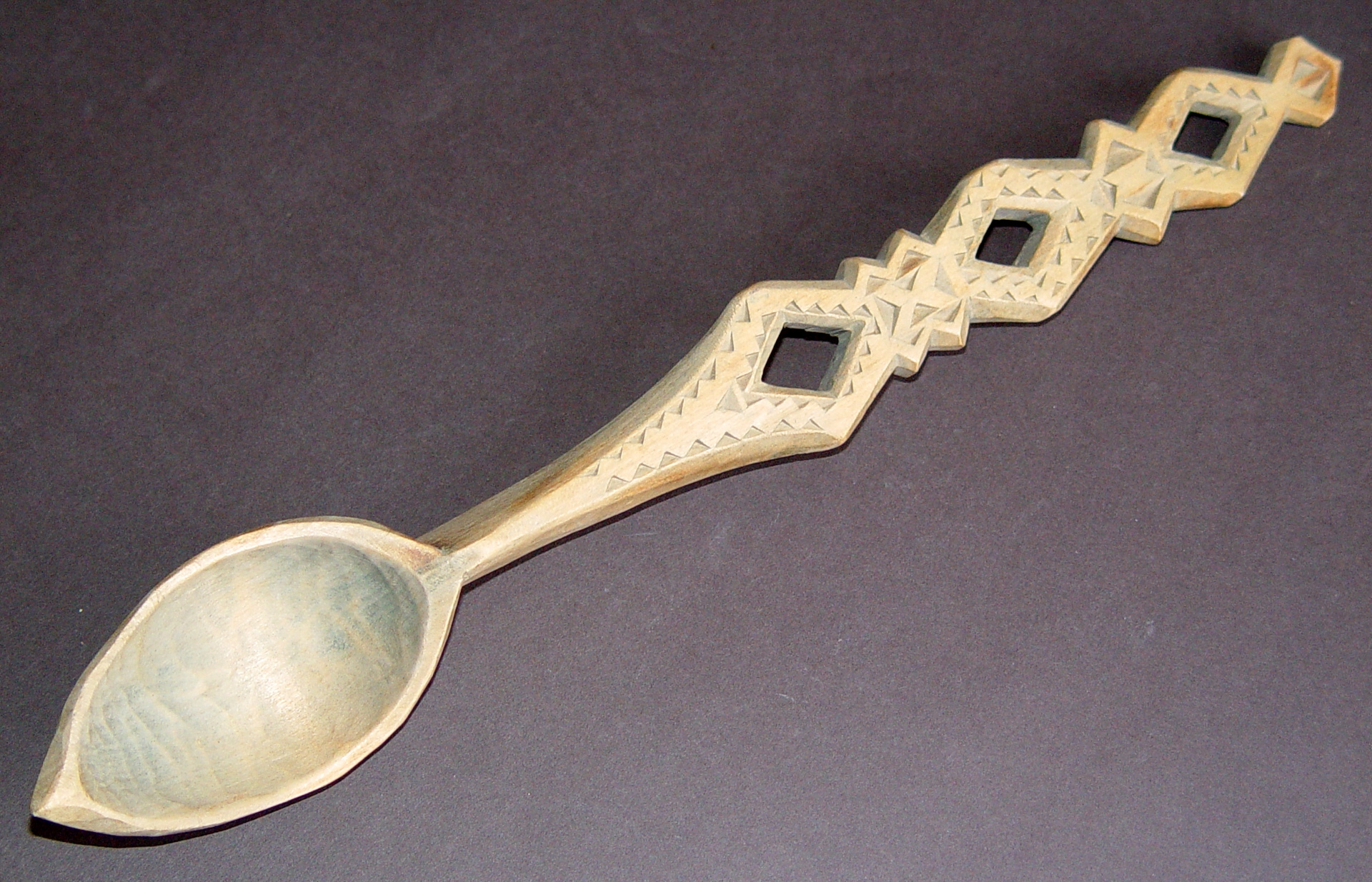Lingură decorativă. Mânerul decorat cu trei găuri romboidale perforate şi ornament reliefat, stilizat vegetal şi geometric