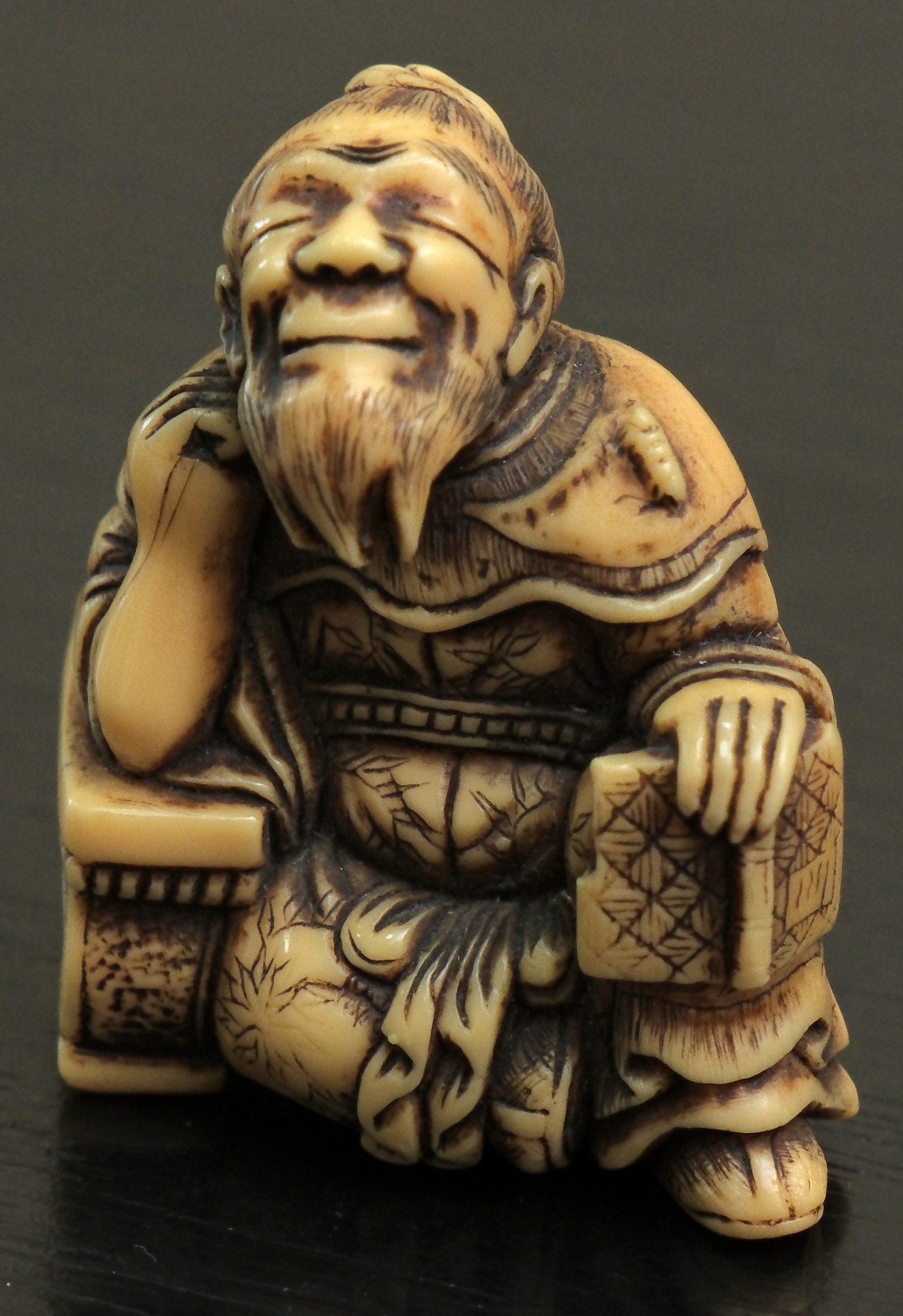 Sculptura miniaturală lucrată în fildeș, înfățișează un personaj masculin așezat, reflectînd o atitudine contemplativă și liniștită, poartă o haină lungă, cu pliuri, incluzînd motive fine gravate ce pun în evidență textura materialului. Așezat în poziție de odihnă regală, cu un picior îndoit și celălalt sprijinit de podea, ține în mîna stîngă o carte, iar cea dreaptă, dusă sub barbie, o susține de o banchetă. Netsuke-ul este prevăzut la spate cu himotoshi (două perforații) care îi permite acestuia să fie utilizat ca obiect de fixare.