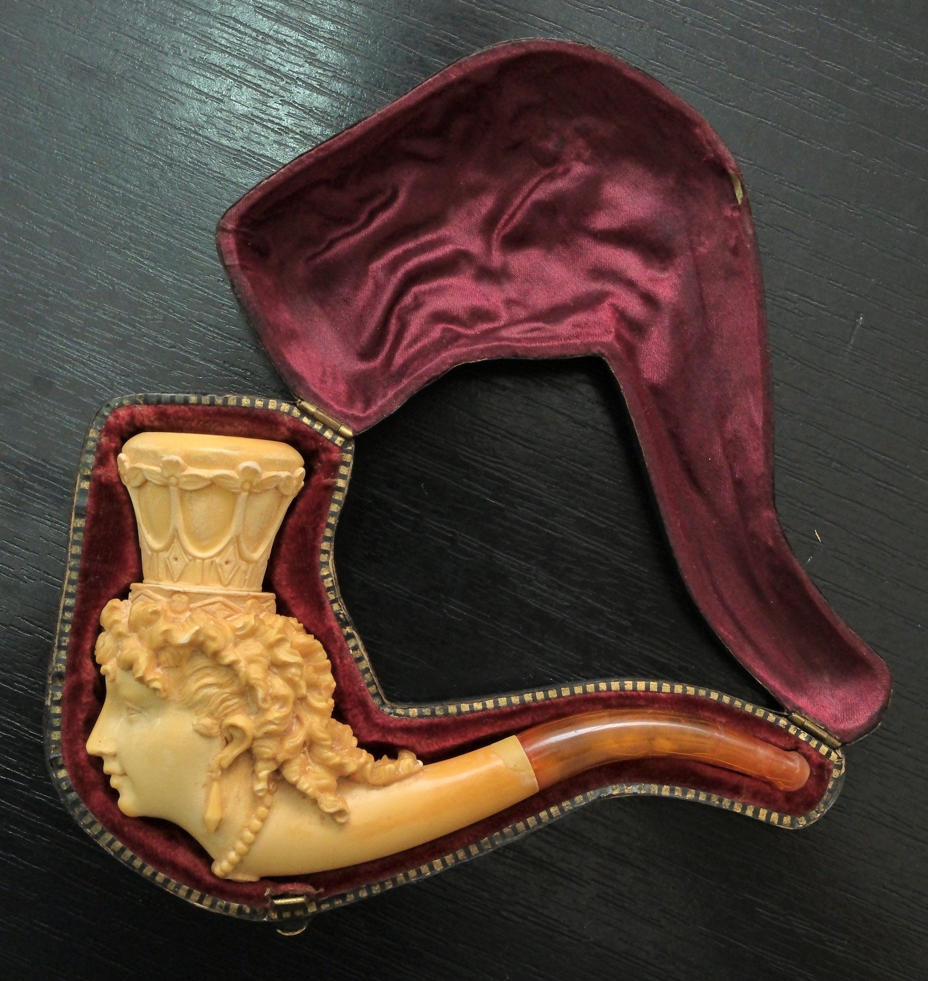 Pipă, înfățișînd un profil feminin, cu detalii care includ bijuterii și o coafură cu bucle curgătoare, iar pe cap în zona creștetului elementul tronconic imită o coroană. Pipa este constituită din două segmente încastrate, ce separă bolul de mustiuc.