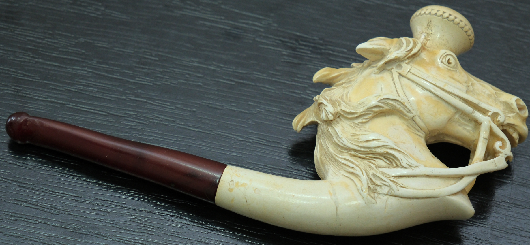 Pipă, înfățișînd un cap de cal în ham, redat cu mici detalii fizionomice în manieră realistă, punînd în evidență starea de tensiune și neliniște a calului. Pipa este constituită din două segmente, imbinate între ele printr-un filet ce separă bolul din fildeș, de mustiucul din chihlimbar.
