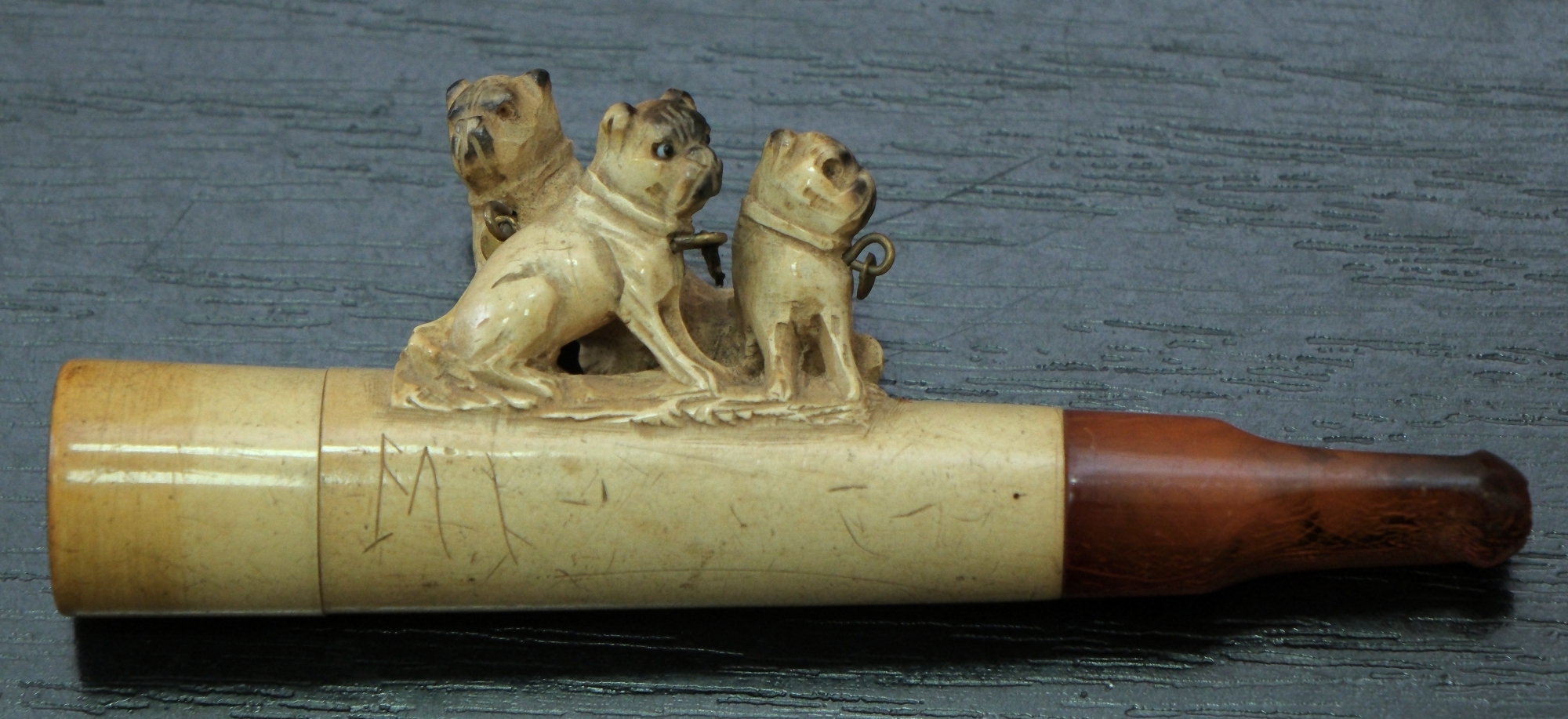Portțigaret manufacturat prin sculptare, înfățișînd 3 mopși în diferite poziții, redați cu detalii fizionomice precise și expresii unice, evidențiind trăsăturile caracteristice ale acestei rasei de cîine. Portțigaretul este constituit din 3 segmente, ce separă bolul și tija din spumă de mare de mustiukul din chihlimbar.
