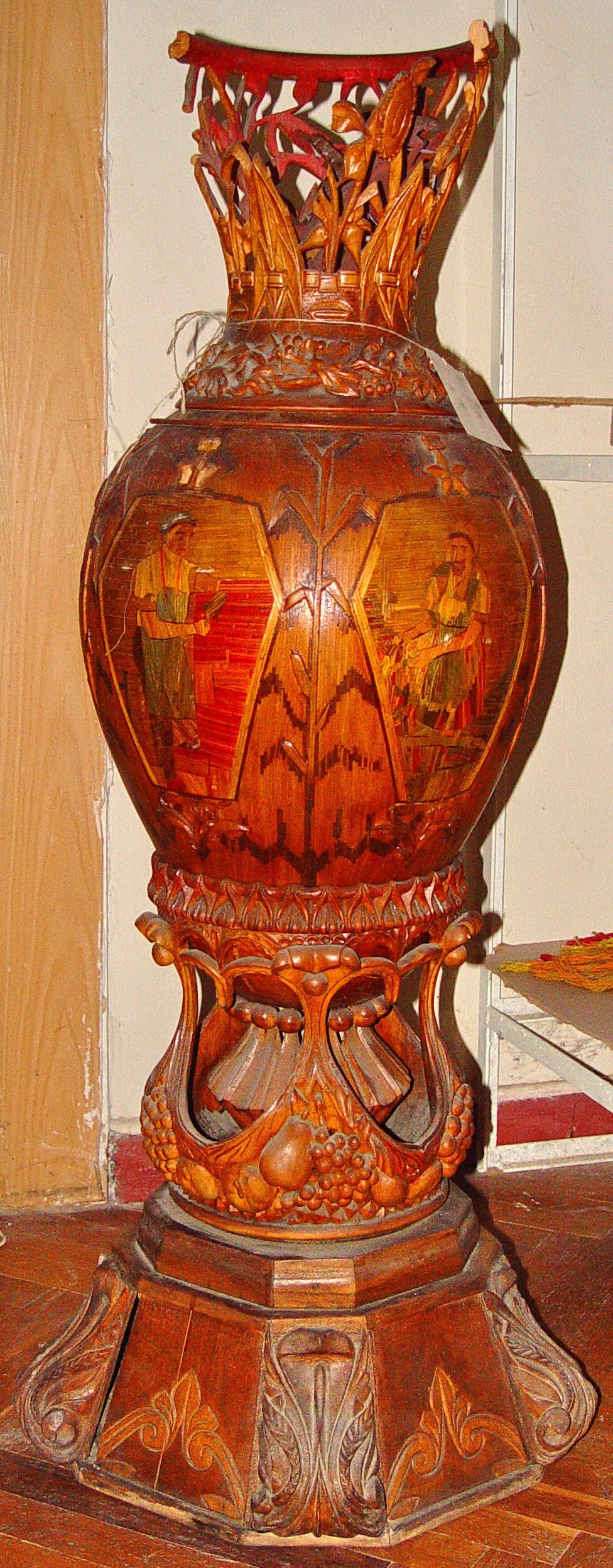 Vază decorativă cu picior. Forma: corpul oval, piciorul şi gâtul tronconice. Este decorat cu incrustaţii din lemn de soi diferit cu ornament vegetal şi geometric, imagini de muncitori şi ţărani. La gât - decor ajurat