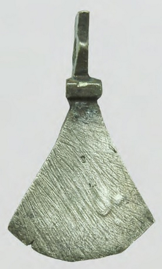 Pandantivul constă dintr-un inel (fragmentar) şi o secure miniaturală, care este suspendată de inel. Tăișul arcuit, laturile oblice.
