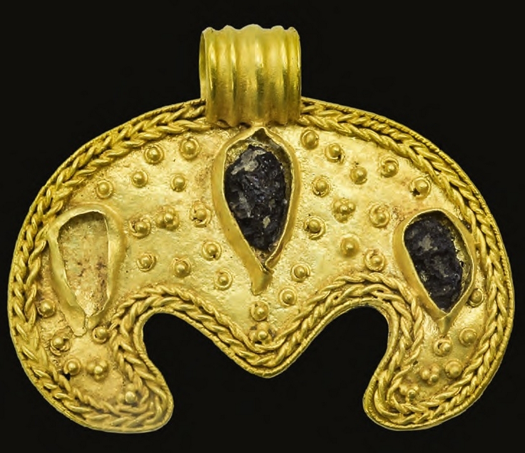 Pandantiv în formă de semilună cu partea centrală triunghiulară proeminentă. Conturul general al lunulei este evidenţiat prin ornamentare cu fir torsionat. Suprafaţa pandantivului este decorată în tehnica granulaţiei cu granule aranjate în formă de piramidă ori dispuse separat. Pe partea exterioară, în centrul şi pe marginile lunulei, sunt sudate trei casete, în două dintre ele păstrându-se inserţiile de pastă sticloasă. Pe mijlocul marginii de sus se află urechiuşa pentru atârnare, din bandă striată