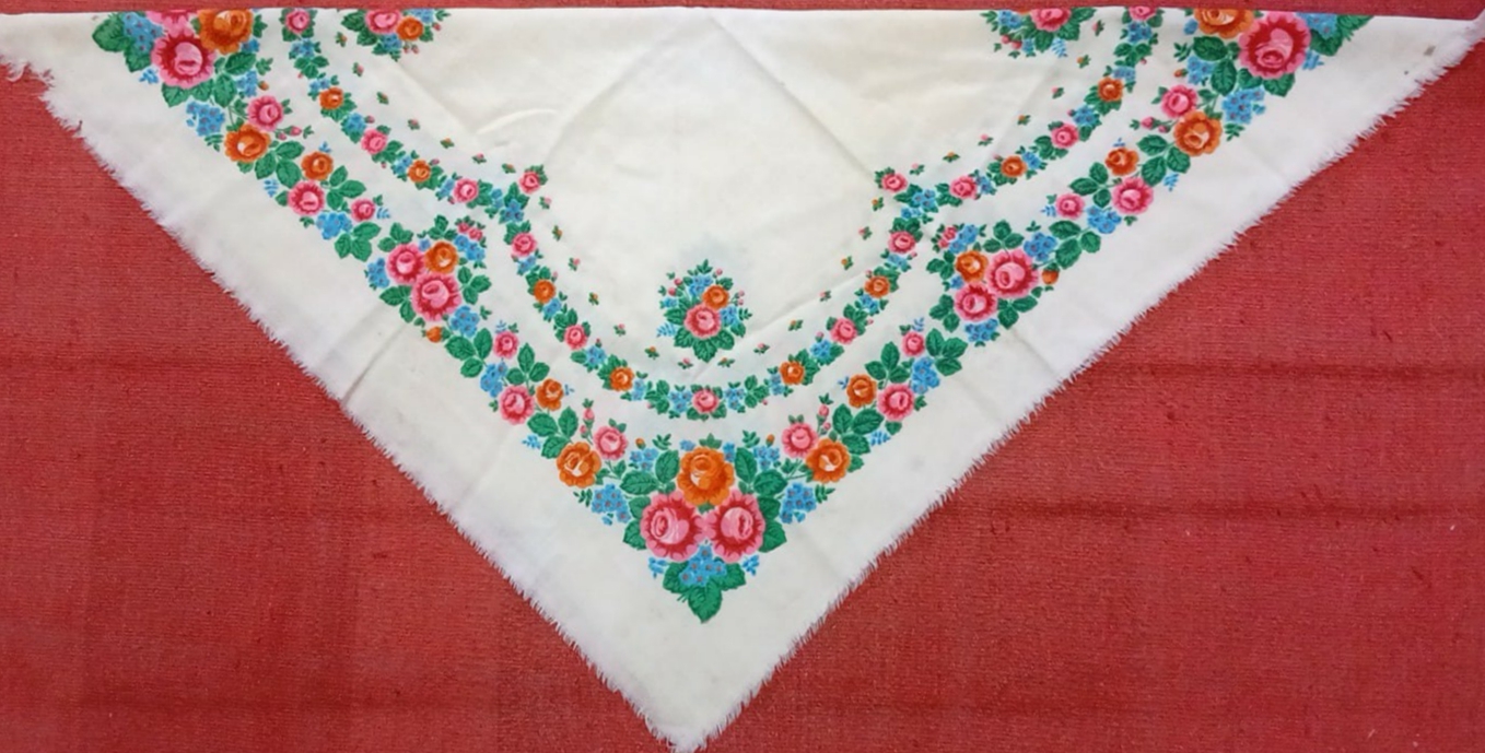 Basmă tradițională pătrată, din țesătură albă, decorată prin imprimeu floral policrom (roz, portocaliu, albastru, verde), cu motive dispuse în ghirlande și buchet central, utilizată ca accesoriu al portului popular feminin.