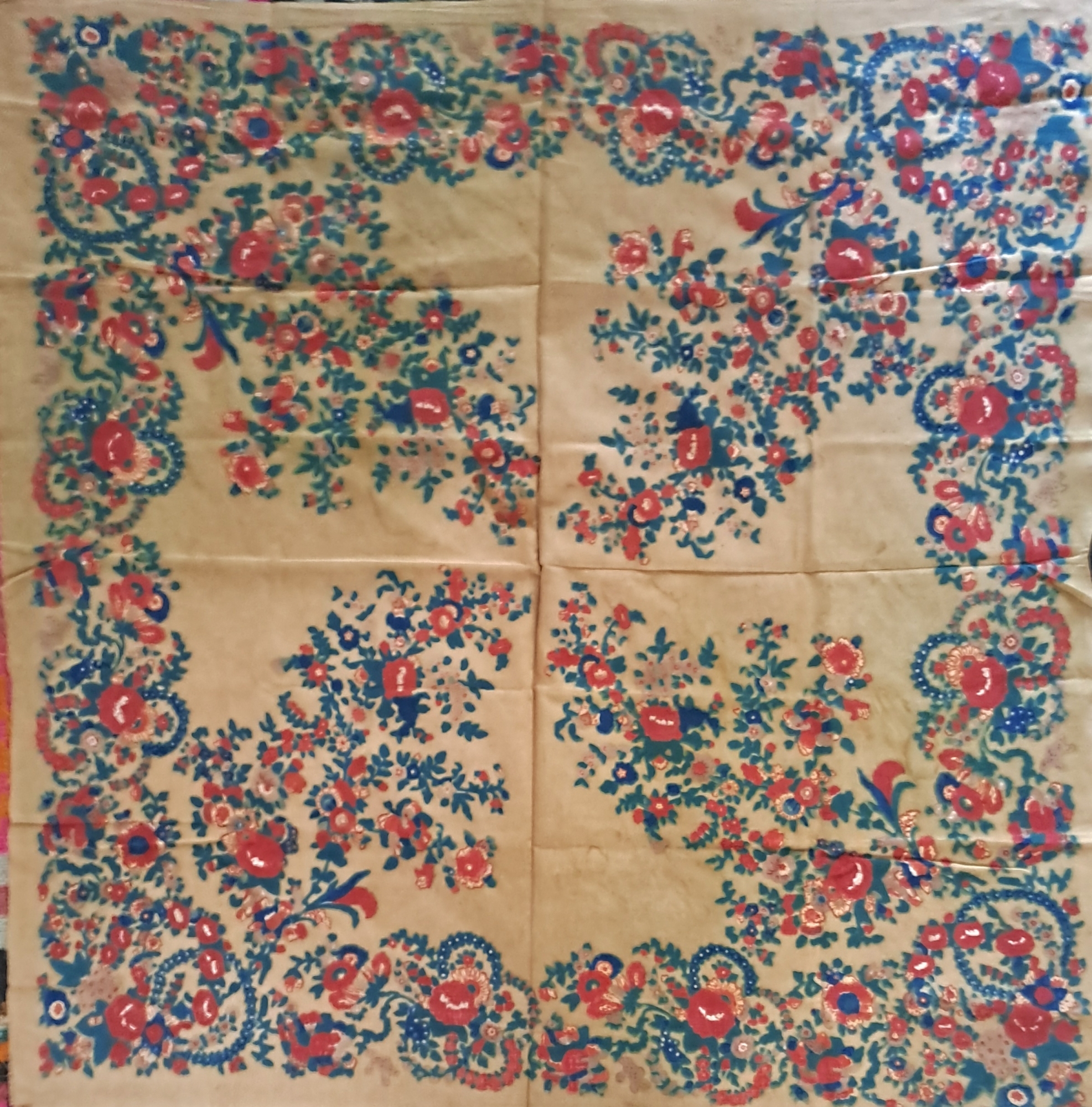 Basma tradițională de formă patrată, țesută din fir de bumbac. Câmp galben cu decor floral policrom imprimat, compus din ornamente florale dispuse pe toată suprafața. Piesă purtată de femei ca acoperitori de cap, sau ca accesoriu vestimentar.