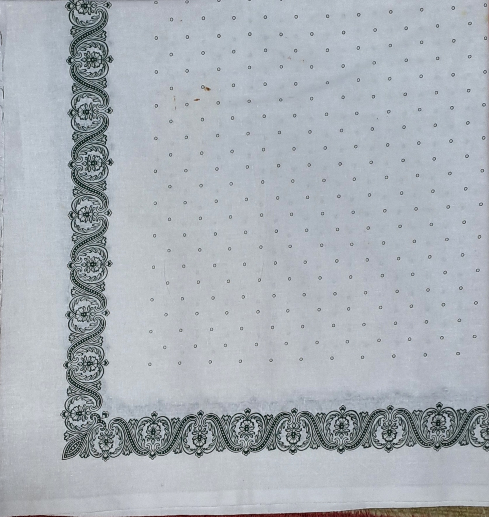 Basma tradițională de formă patrată, țesută din fir de bumbac. Câmp alb cu decor floral policrom imprimat de culoare verde. Piesă purtată de femei ca acoperitori de cap.