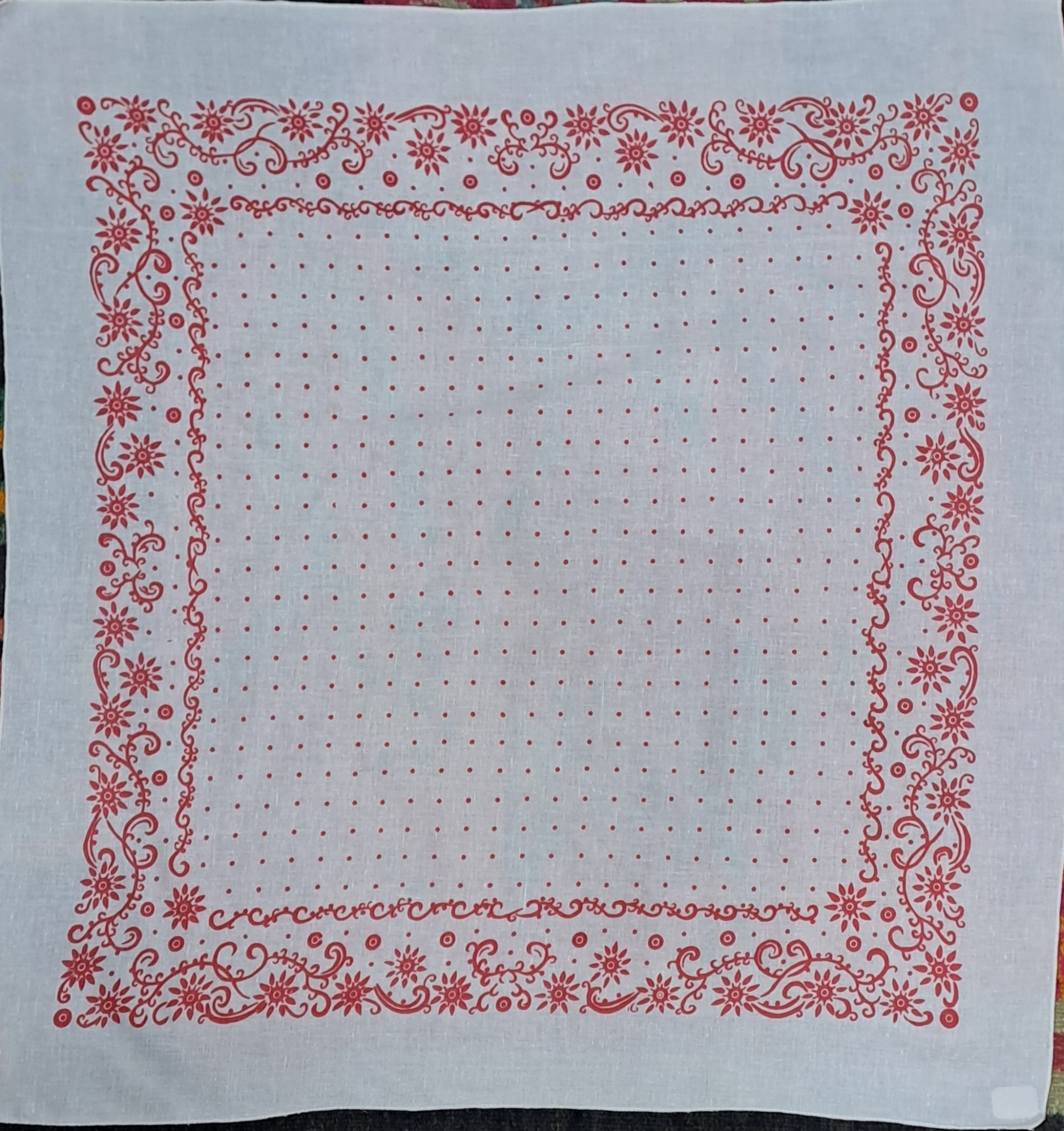 Basma tradițională de formă patrată, țesută din fir de bumbac. Câmp alb cu decor floral policrom imprimat de culoare roșie. Piesă purtată de femei ca acoperitori de cap.