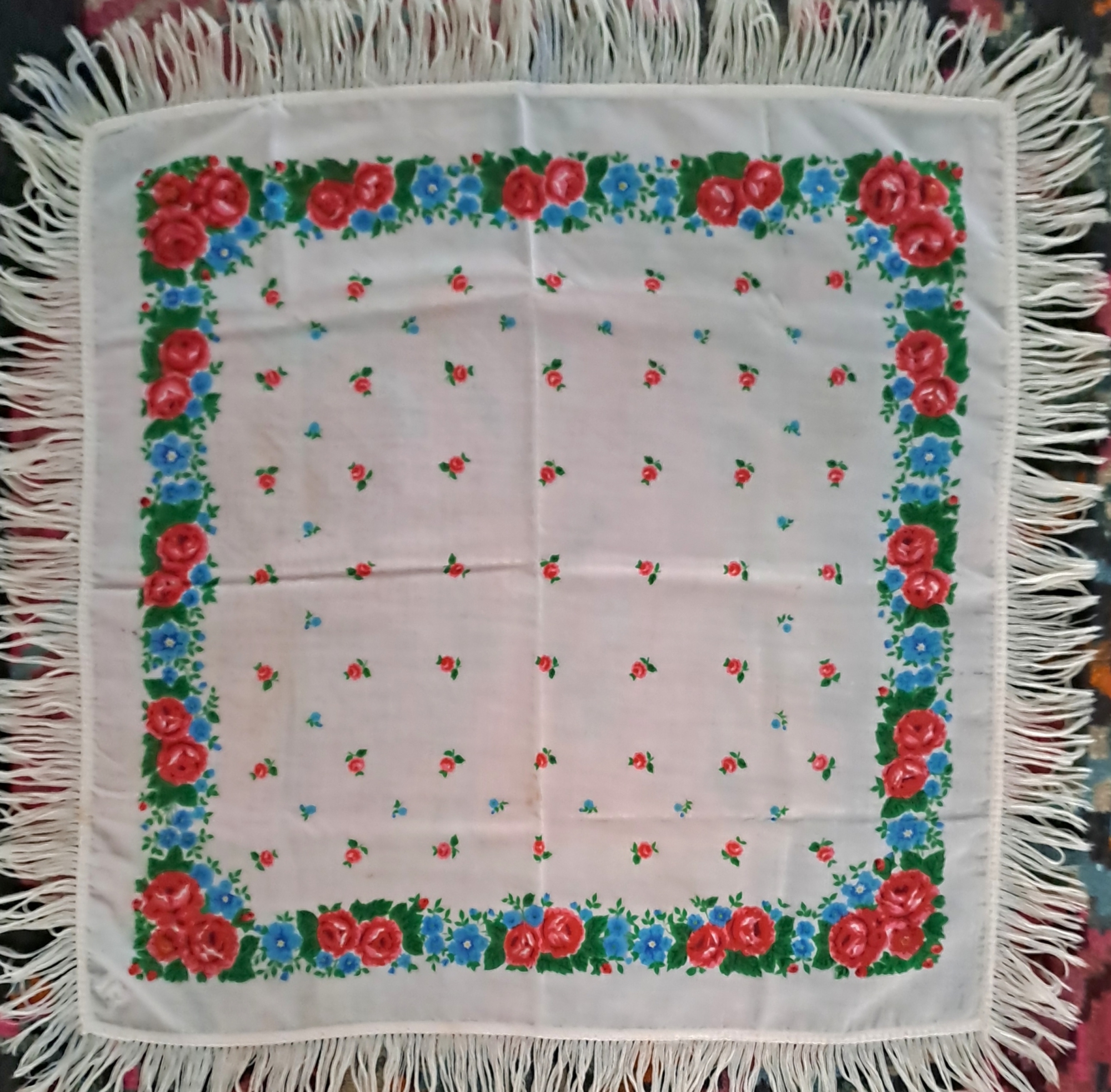 Basma tradițională de formă patrată, țesută din fir de lână. Câmp alb cu decor floral policrom imprimat, compus din ornamente florale dispuse pe toată suprafața, pe margini franjuri scurte. Piesă purtată de femei ca acoperitori de cap, sau ca accesoriu vestimentar.