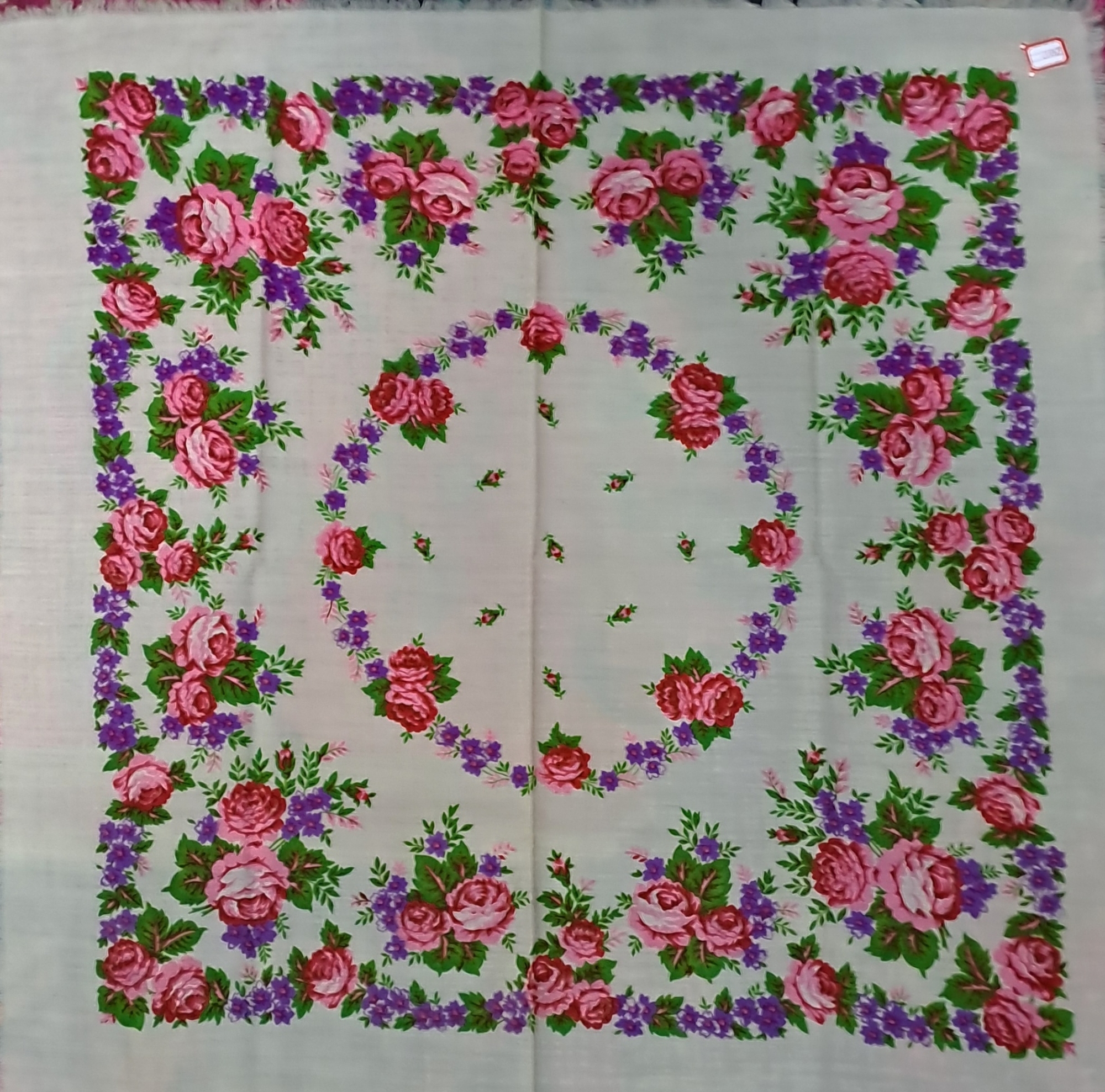 Basma tradițională de formă patrată, țesută din fir de lână . Câmp alb cu decor floral policrom imprimat , compus din ornamente florale dispuse pe toată suprafața. Piesă purtată de femei ca acoperitori de cap, sau ca accesoriu vestimentar.