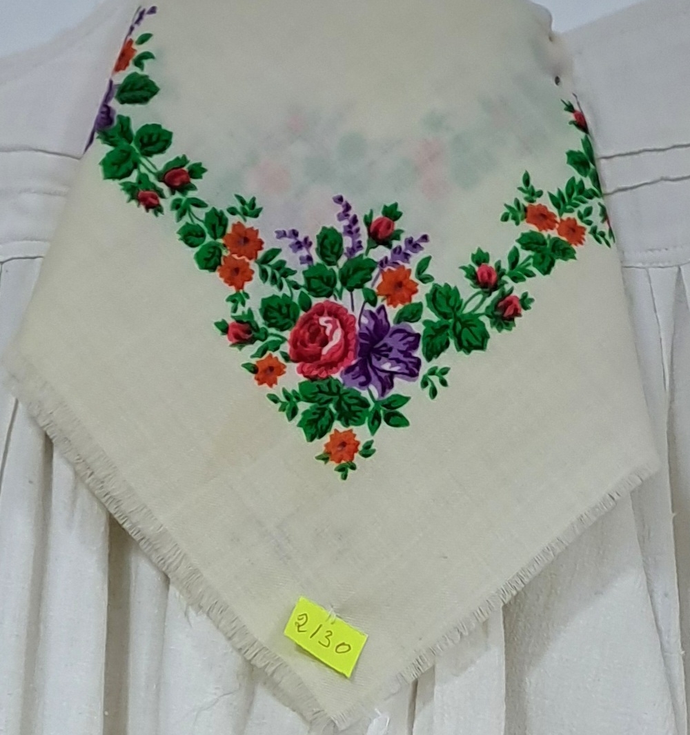 Basma tradițională de formă patrată, țesută din fir de lână. Câmp alb cu decor floral policrom imprimat dispus pe toată suprafața, pe margini franjuri scurte. Piesă purtată de femei ca acoperitori de cap, sau ca accesoriu vestimentar.