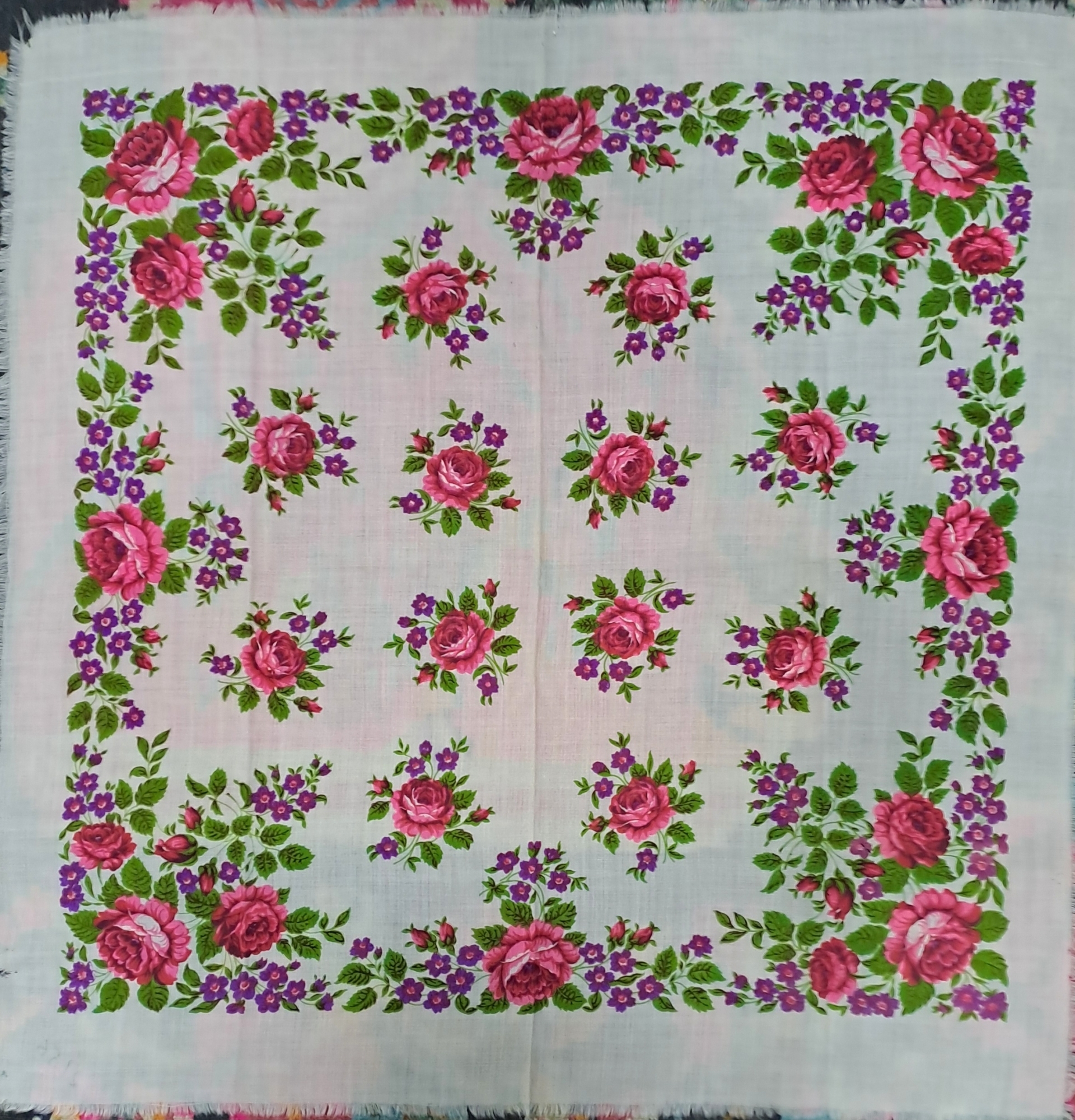 Basma tradițională de formă patrată, țesută din fir de lână. Câmp alb cu decor floral policrom imprimat , compus din ornamente florale, dispuse pe toată suprafața, pe margini franjuri scurte. Piesă purtată de femei ca acoperitori de cap, sau ca accesoriu vestimentar.