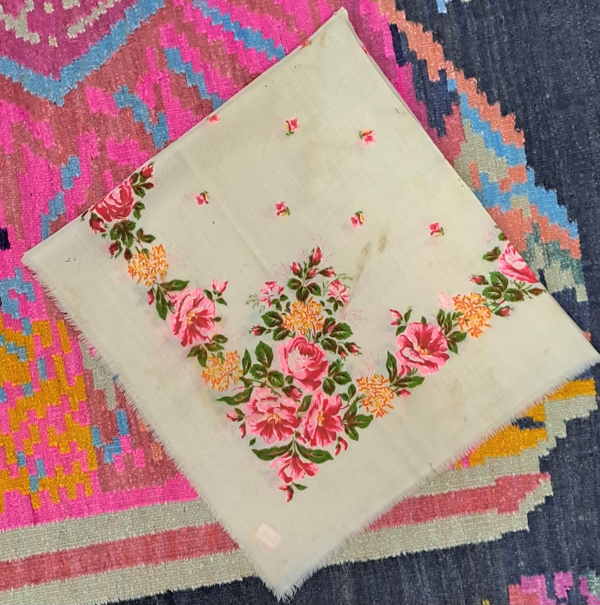 Basma tradițională de formă patrată, țesută din fir de lână. Câmp alb cu decor floral policrom imprimat , compus din ornamente florale, dispuse pe toată suprafața, pe margini franjuri scurte. Piesă purtată de femei ca acoperitori de cap, sau ca accesoriu vestimentar.