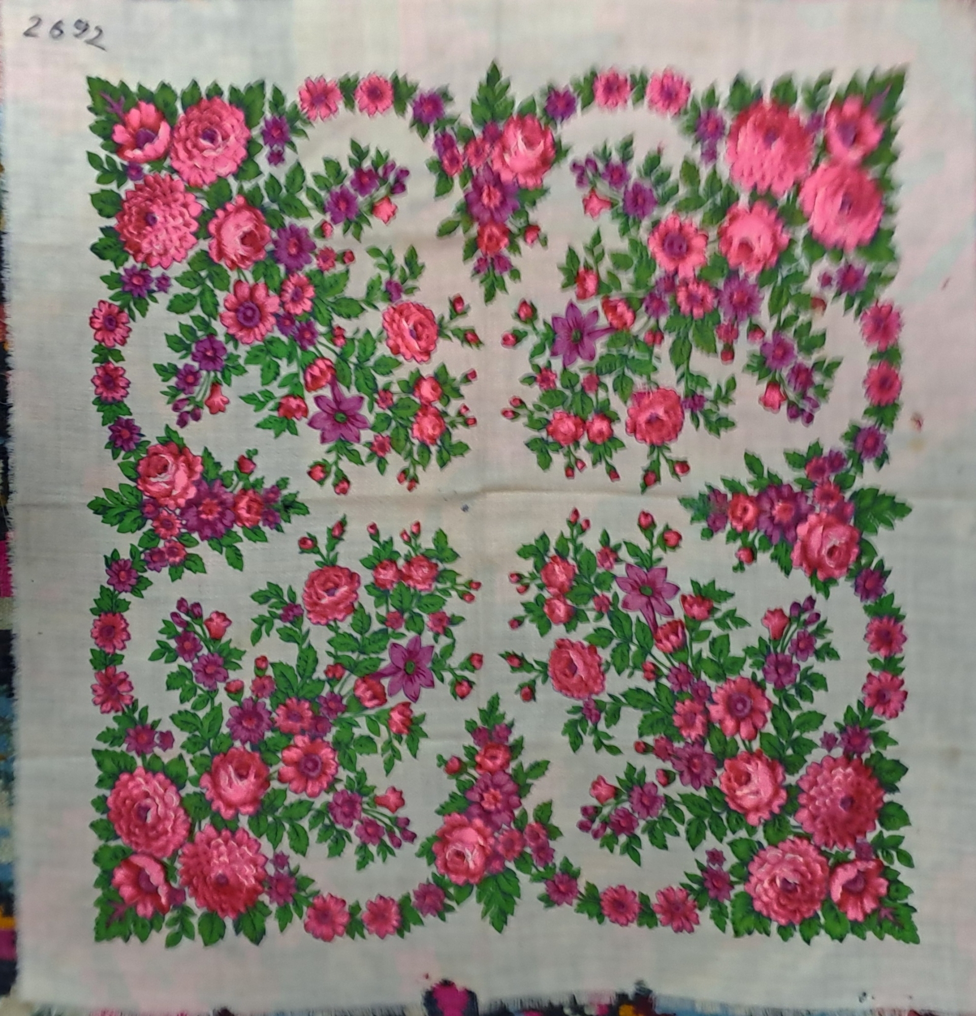 Basma tradițională de formă patrată, țesută din fir de lână. Câmp alb cu decor floral policrom imprimat , compus din ornamente florale dispuse pe toată suprafața. Piesă purtată de femei ca acoperitori de cap, sau ca accesoriu vestimentar.